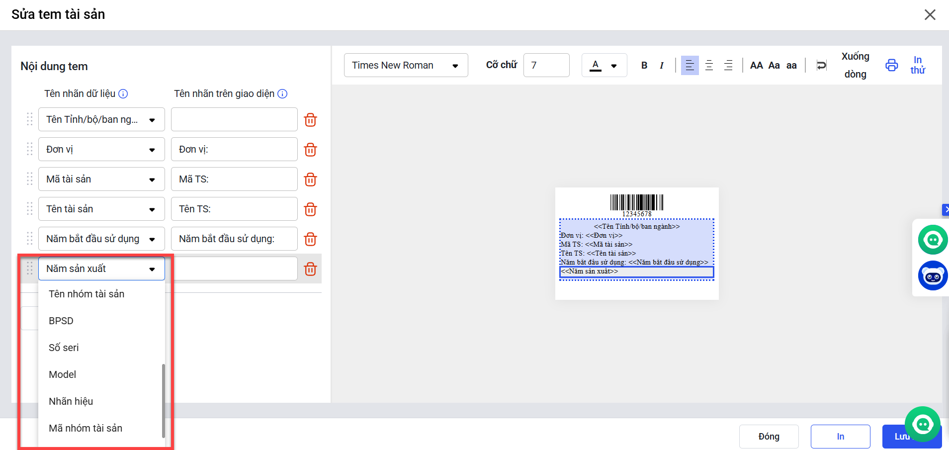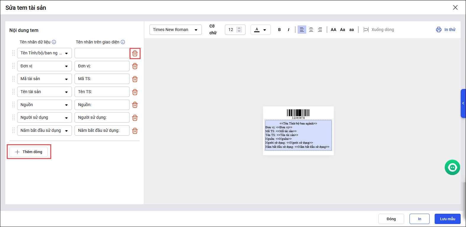Khi cần bổ sung, xóa hoặc điều chỉnh thông tin hiển thị trên tem tài sản/mã vạch, anh/chị thực hiện như sau: