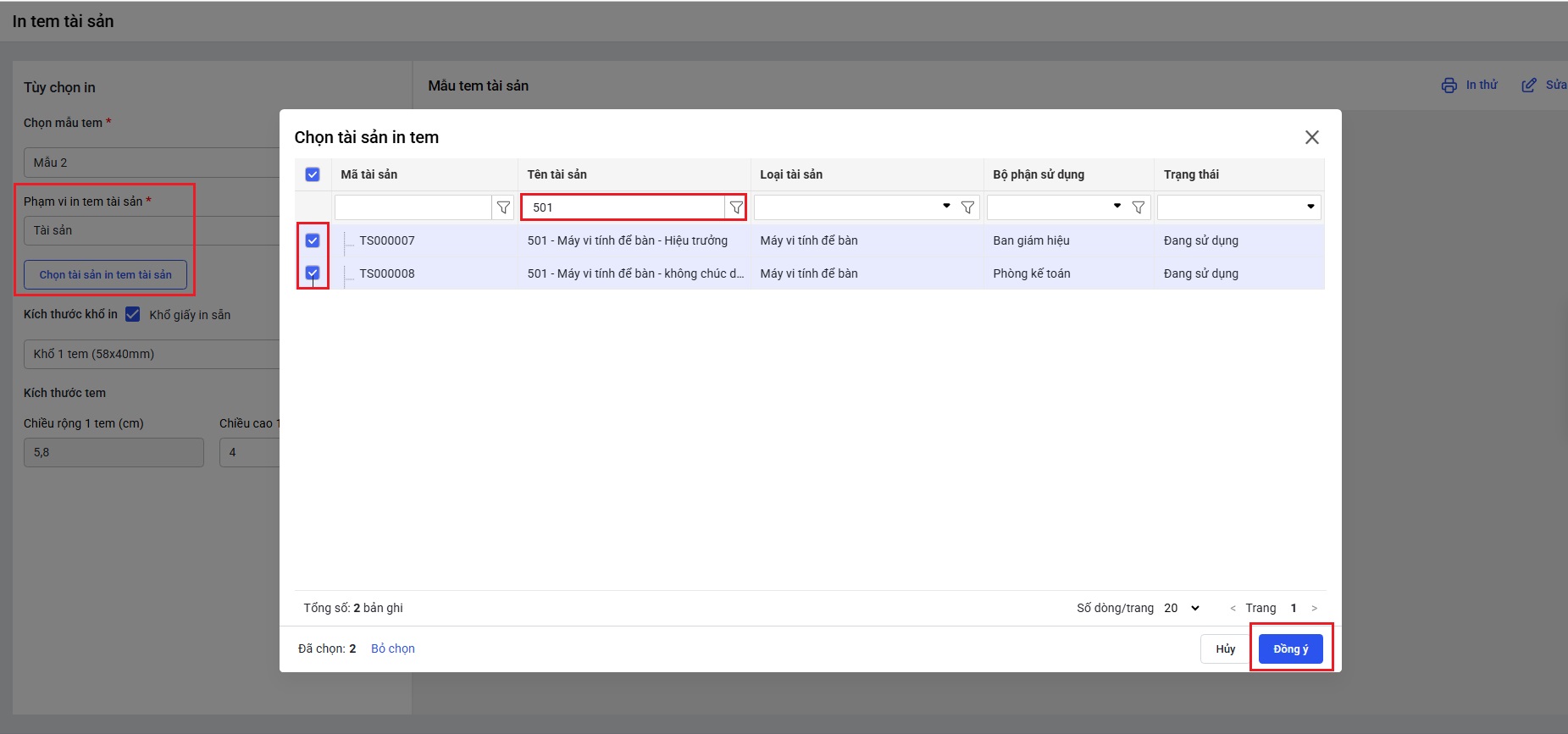 Bước 4: Tích chọn các tài sản vừa lọc, cần in tem và nhấn Đồng ý