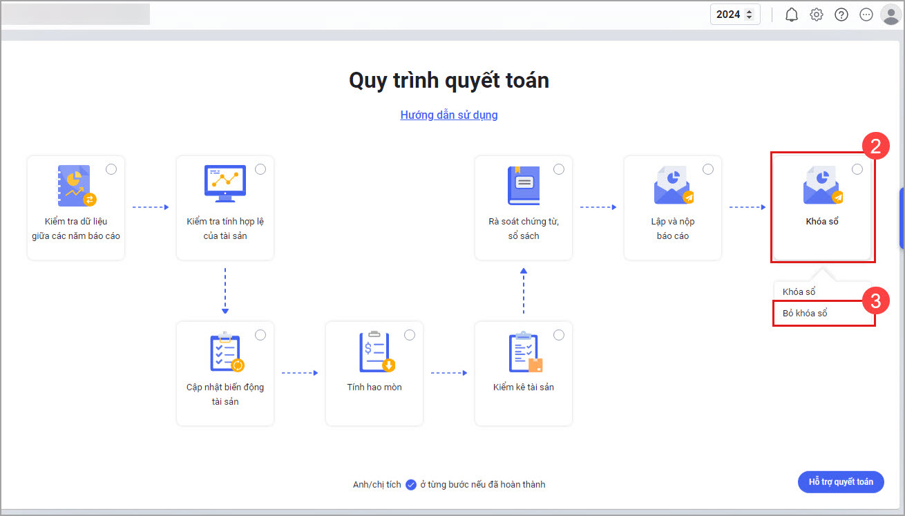 - Cách 2. Bỏ khóa sổ tại menu Hỗ trợ quyết toán.