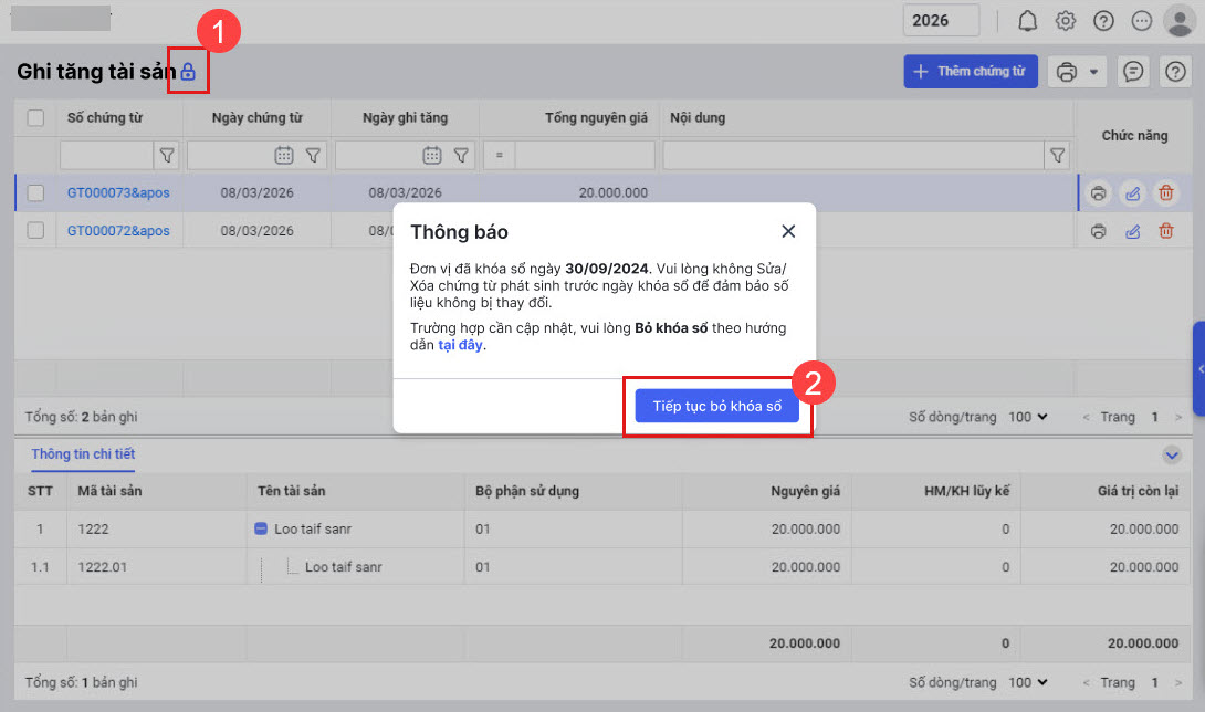 - Cách 3. Bỏ khóa sổ tại biểu tượng khóa sổ trên phần mềm, sau đó chọn Tiếp tục bỏ khóa sổ.