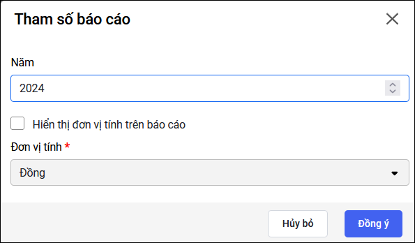 Bước 2: Khai báo tham số báo cáo: Chọn Năm in báo cáo và nhấn Đồng ý.