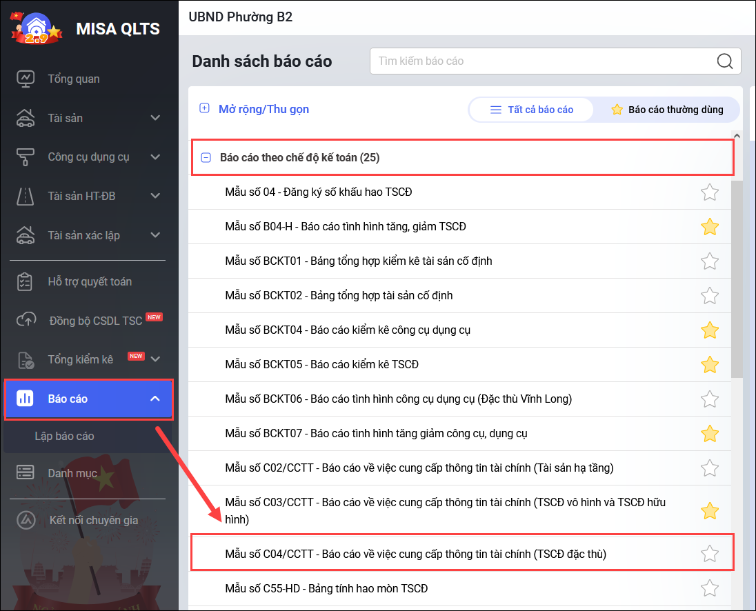 Bước 1: Vào menu Báo cáo\Báo cáo theo chế độ kế toán.Tại đây phần mềm đã bổ sung Mẫu số C04/CCTT: Báo cáo về việc cung cấp thông tin tài chính (TSCĐ đặc thù).