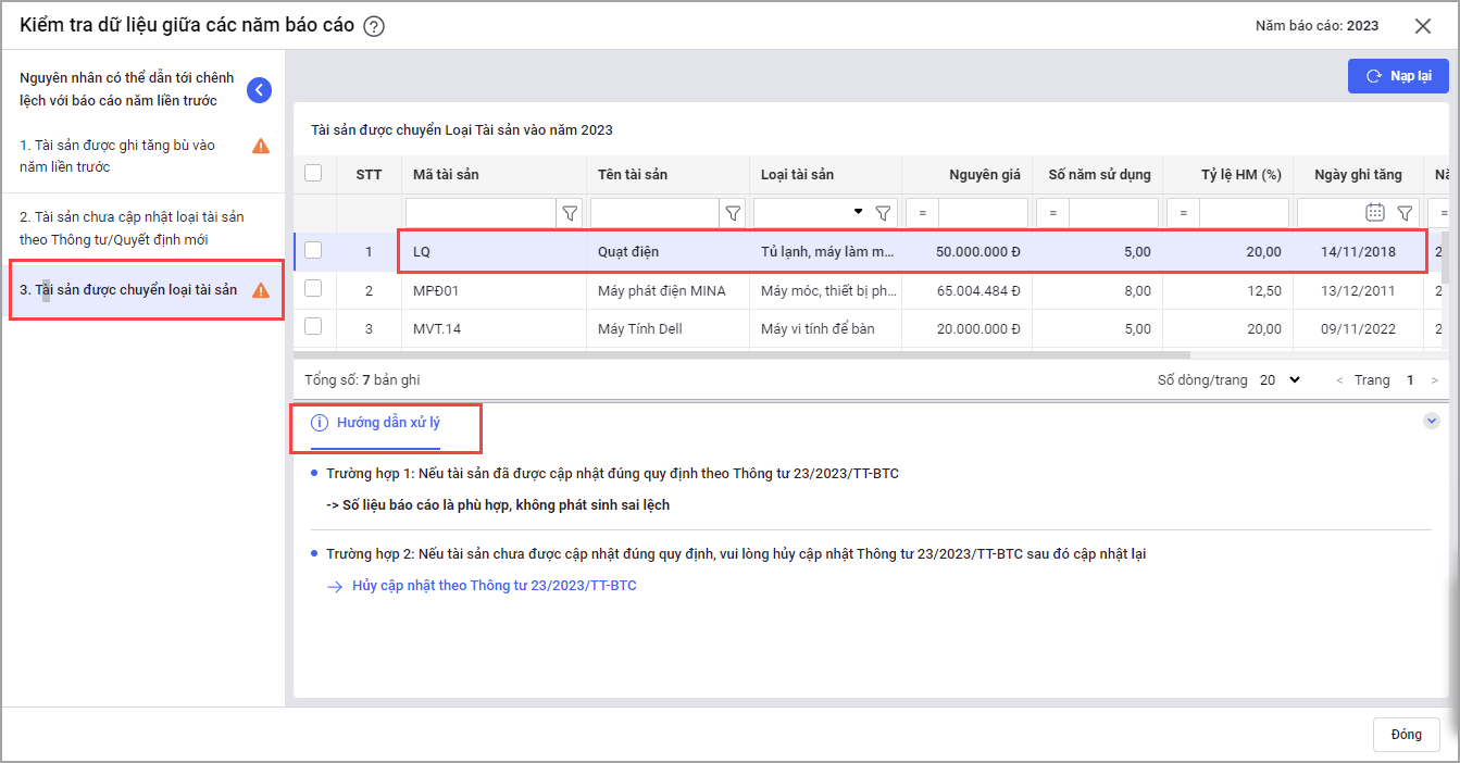 - Phần mềm chỉ ra lỗi sai lệch dữ liệu báo cáo do Tài sản được chuyển loại tài sản.