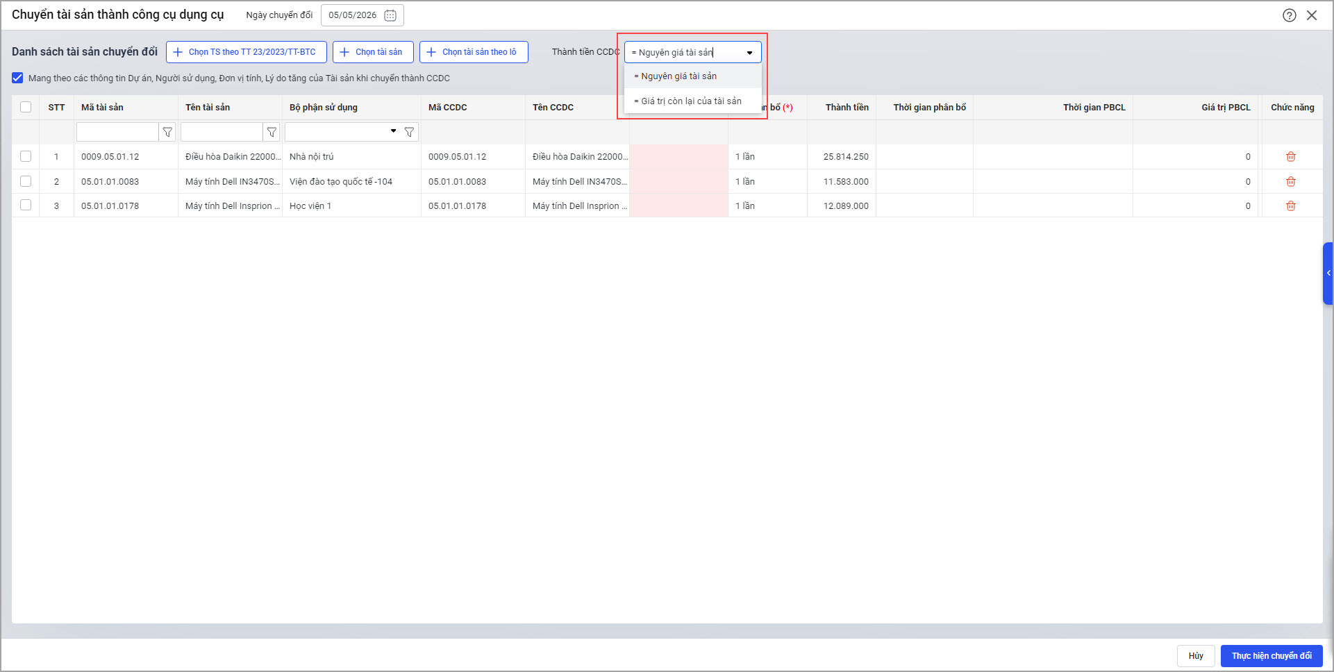 Kể từ phiên bản R56: Anh/chị dễ dàng xác định tài sản nào đã được chuyển thành CCDC để kiểm tra và điều chỉnh thông tin khi cần. Đồng thời, có thể nắm rõ cách phần mềm xác định thành tiền của CCDC sau khi chuyển đổi từ tài sản.