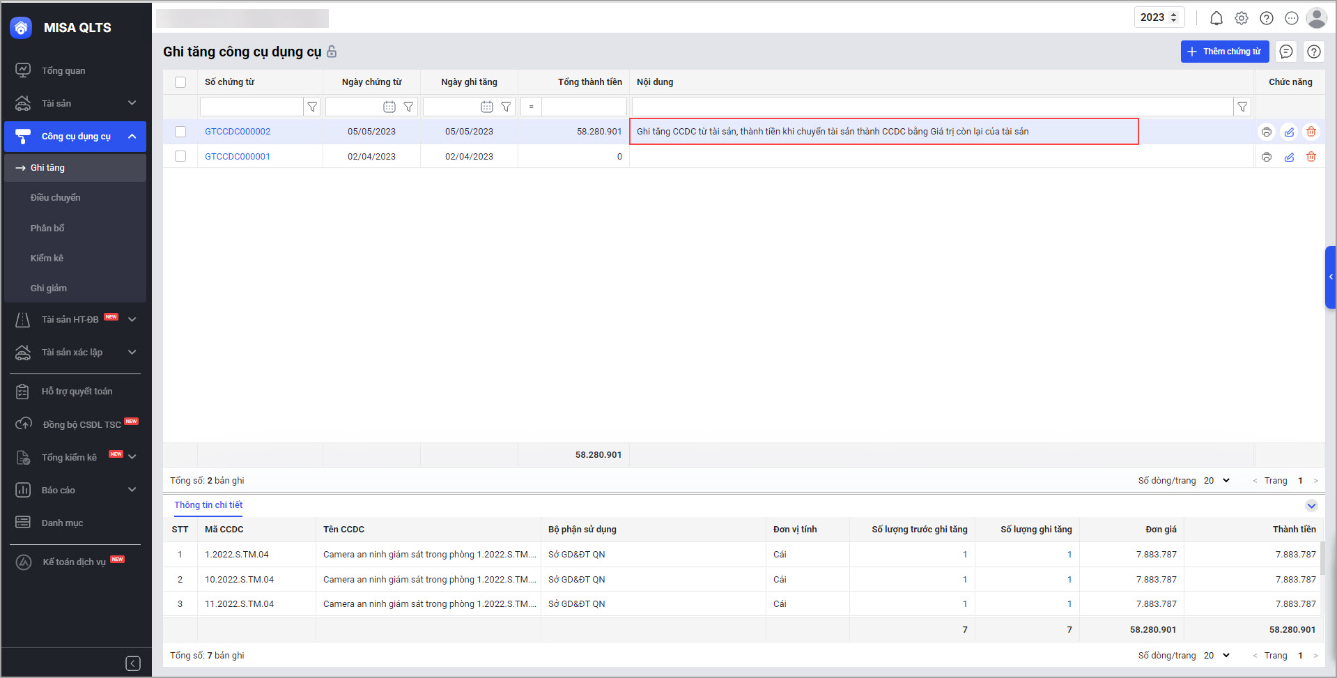 Tại chứng từ Ghi tăng của CCDC, nếu tài sản được chuyển từ tài sản cố định sang công cụ dụng cụ, phần mềm sẽ tự động hiển thị lý do ghi tăng tại cột Nội dung để người dùng dễ theo dõi.