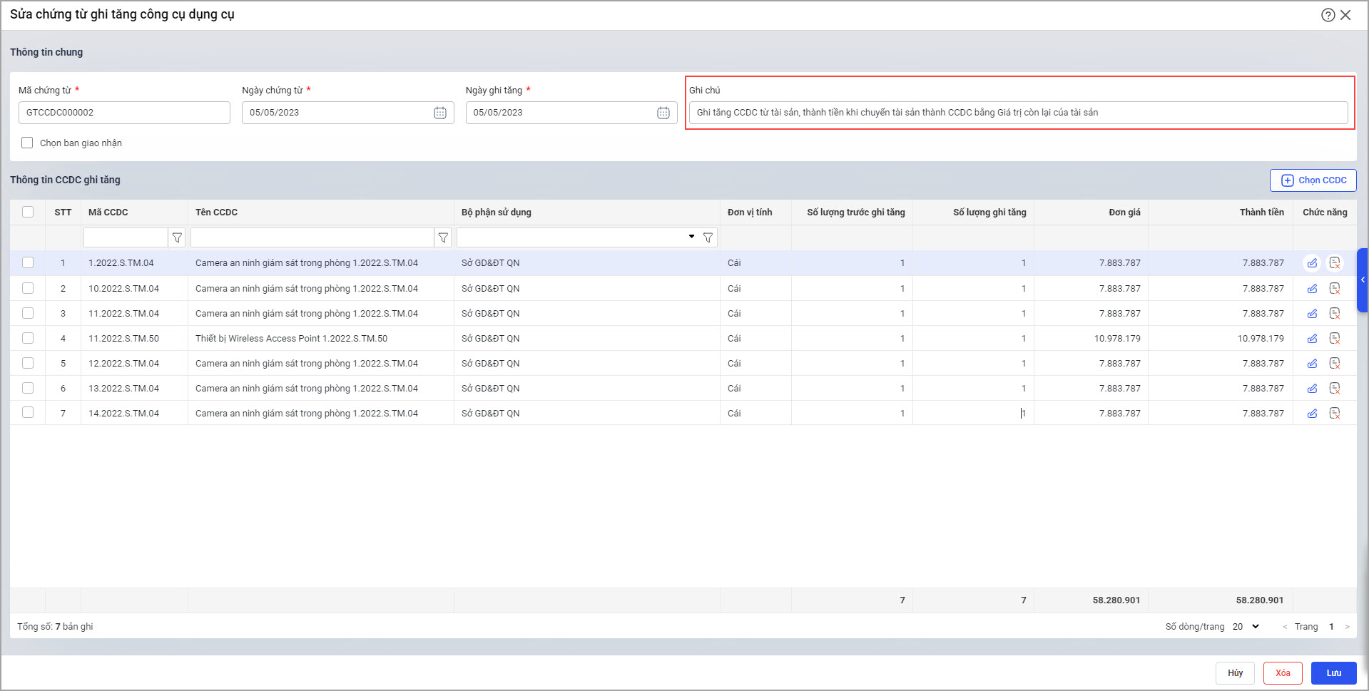 Chi tiết chứng từ chuyển tài sản thành CCDC, phần mềm sẽ tự động hiển thị lý do ghi tăng tại cột Ghi chú để người dùng dễ theo dõi.