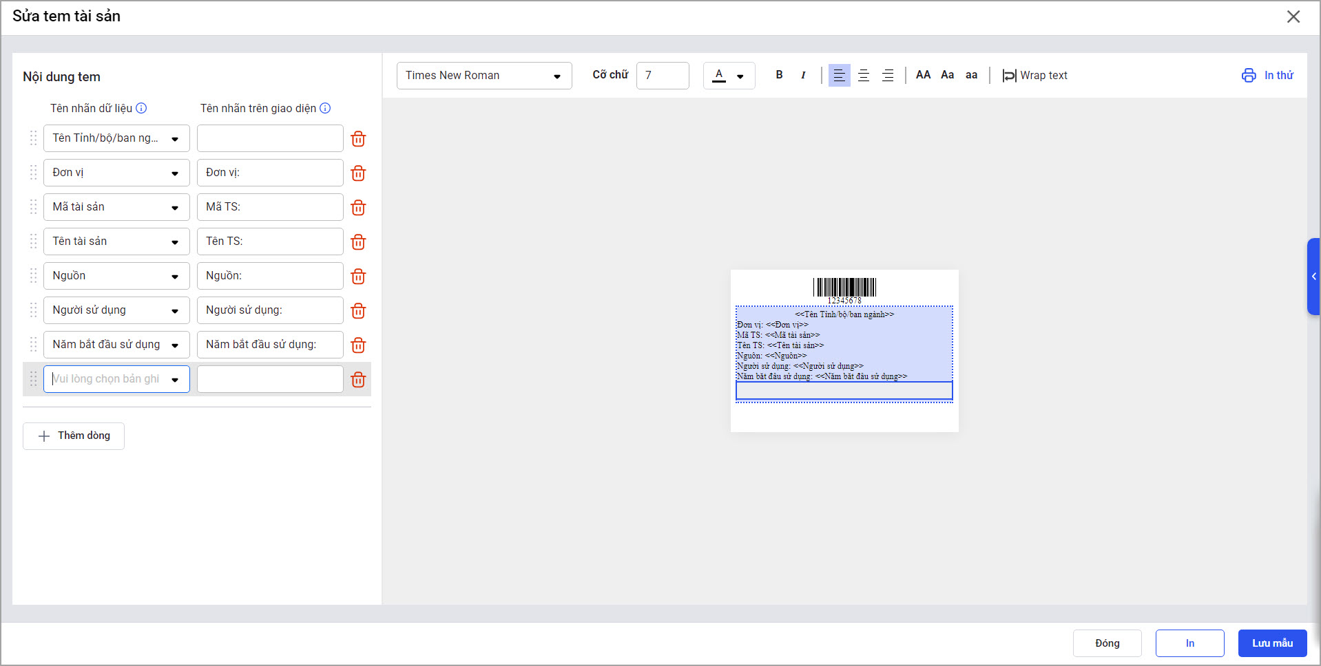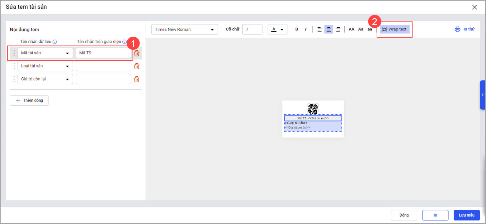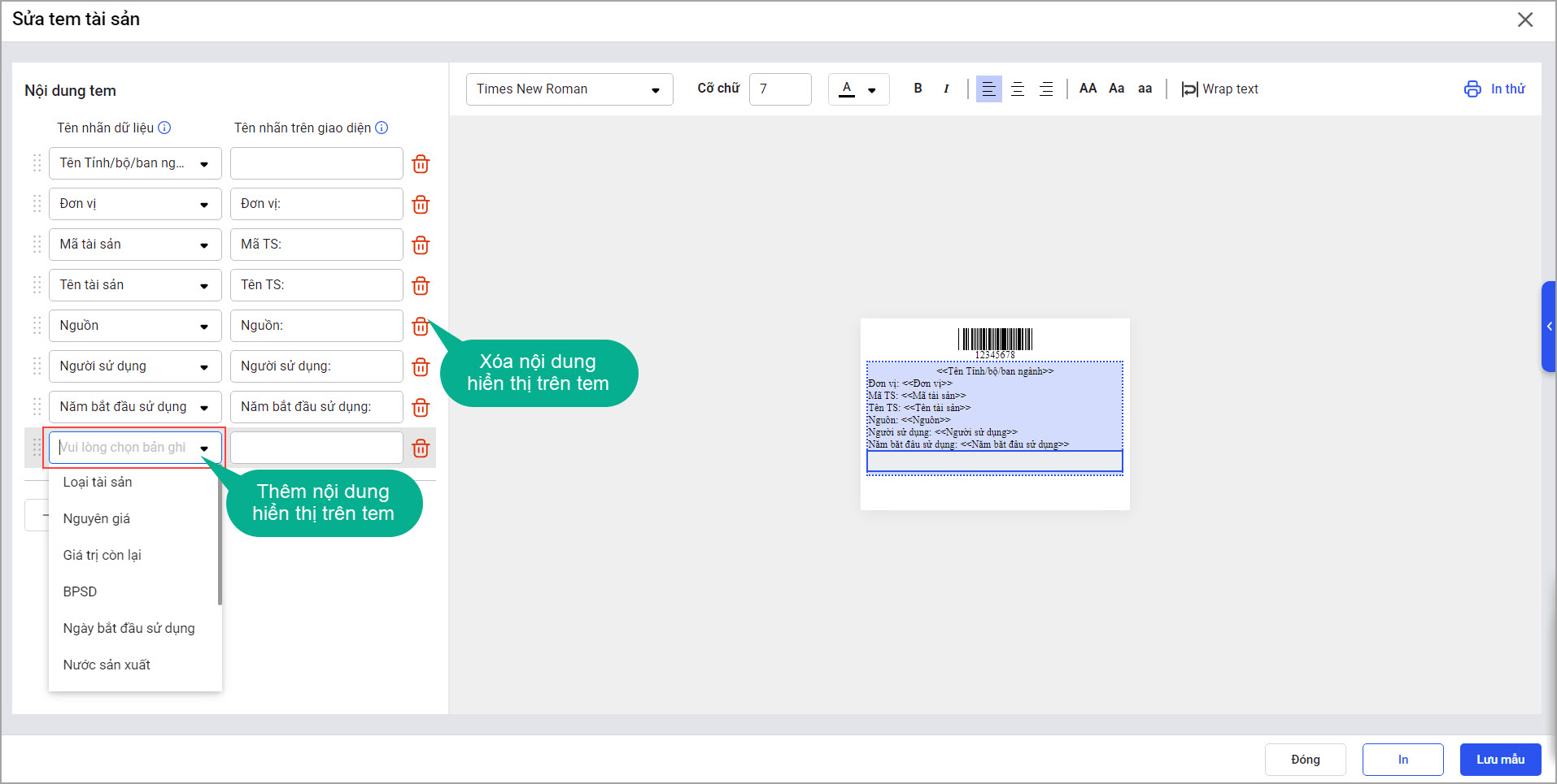 - Thêm/xóa nội dung được hiển thị trên tem tài sản