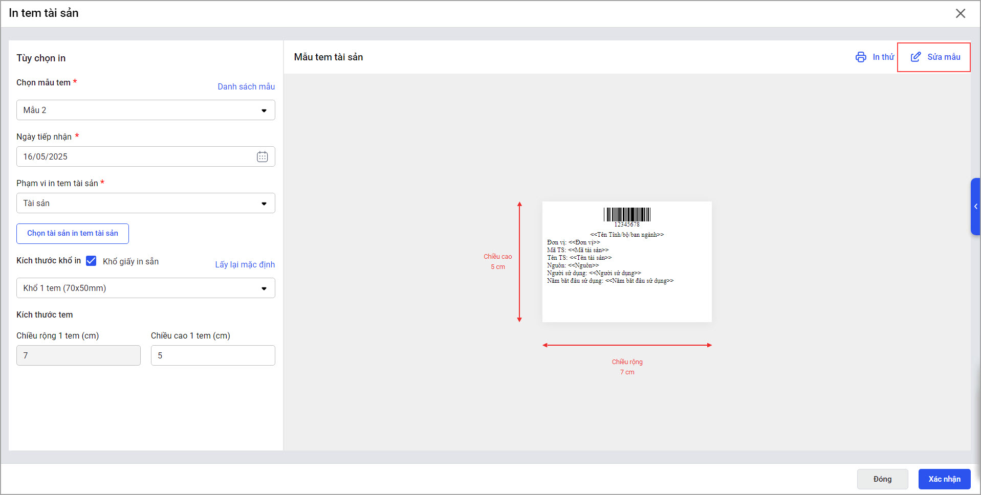 - Để thiết lập nội dung hiển thị trên tem tài sản, anh/chị chọn Sửa mẫu