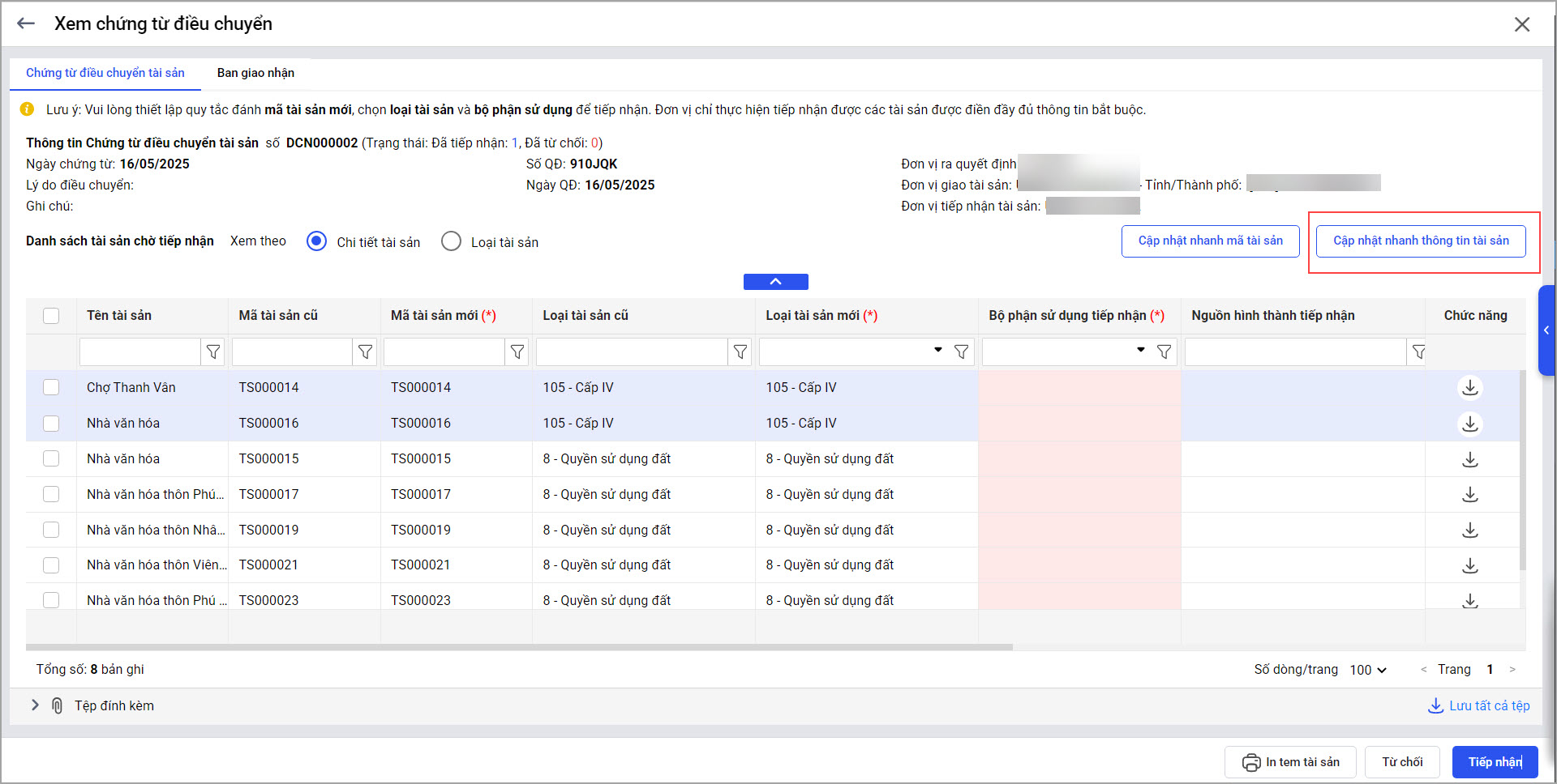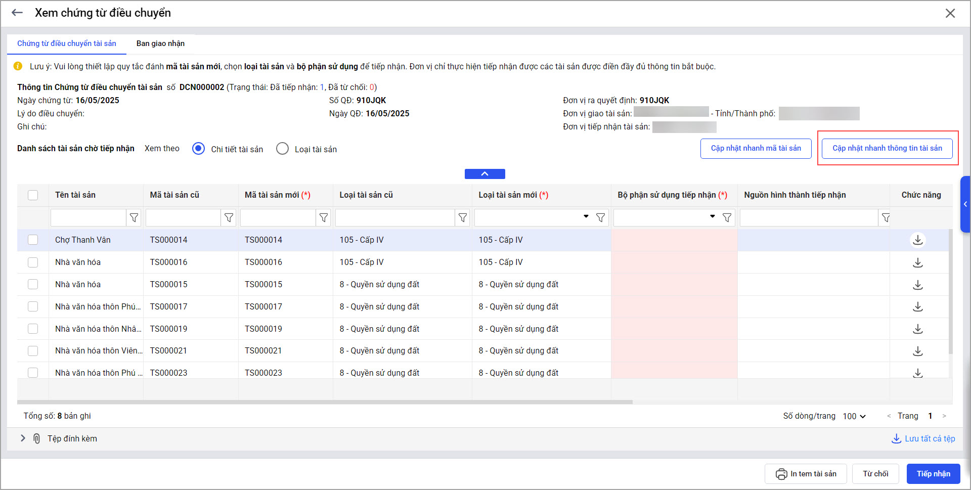 - Cập nhật hàng loạt các thông tin chung (Nguồn hình thành, Bộ phận sử dụng, Loại tài sản).
