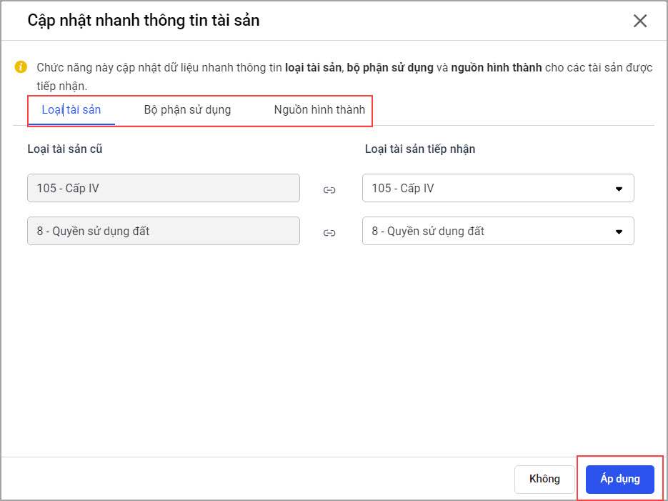 - Anh/chị chọn nhanh Loại tài sản/Bộ phận sử dụng/Nguồn hình thành cho nhiều tài sản cùng lúc, chọn Áp dụng