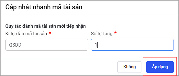 Nhập quy tắc đánh mã tài sản mới tiếp nhận, chọn Áp dụng