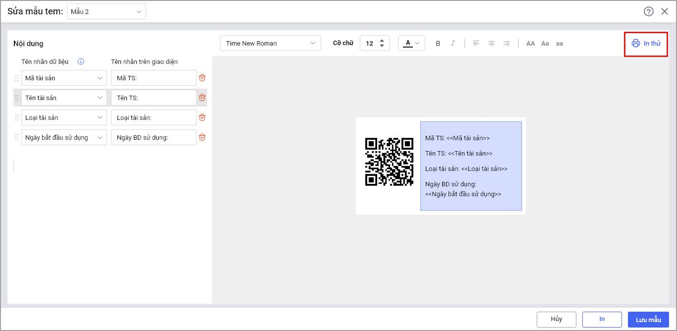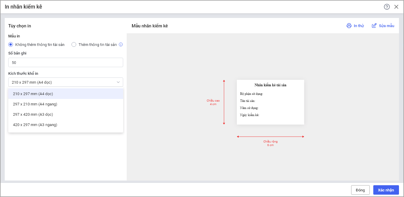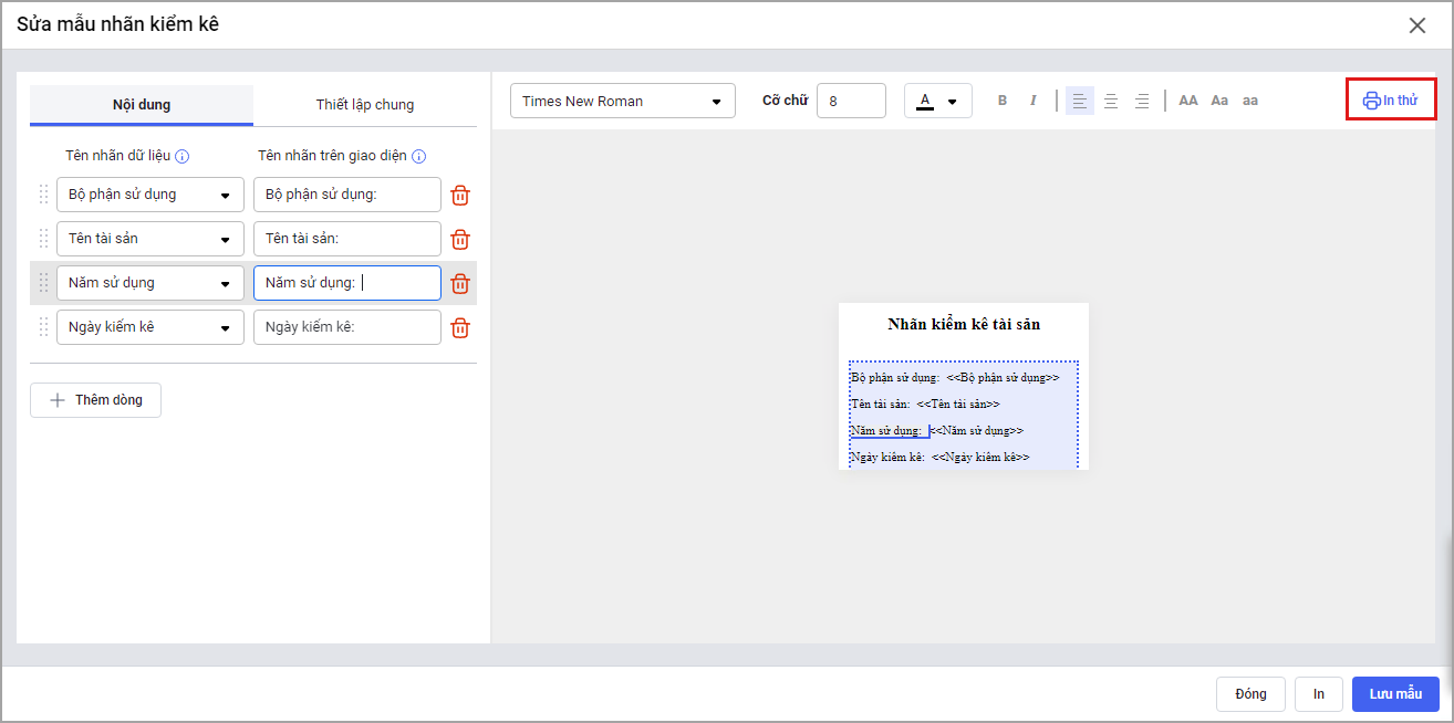 • Chọn In thử để xem trước nội dung được in trong Nhãn kiểm kê tài sản