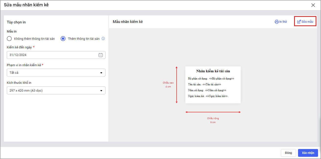 Bước 2: Nhấn Sửa mẫu (góc trên cùng tay phải) để sửa lại kích thước/nội dung hiển thị của Nhãn kiểm kê.