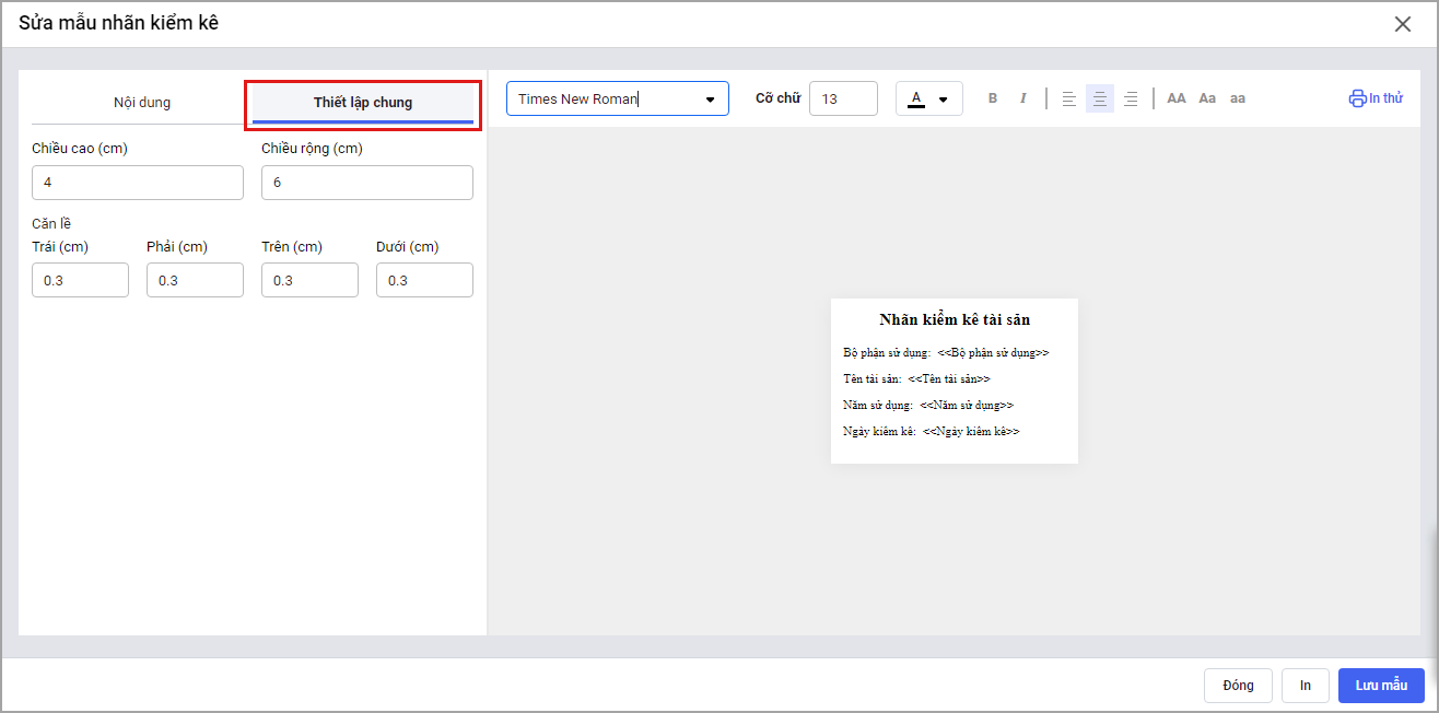 • Tại phần Thiếp lập chung, anh/chị có tùy chỉnh kích thước của Nhãn kiểm kê và kích thước theo ý muốn bao gồm: Chiều cao, Chiều rộng, Căn lề: Trái, Phải, Trên, Dưới.