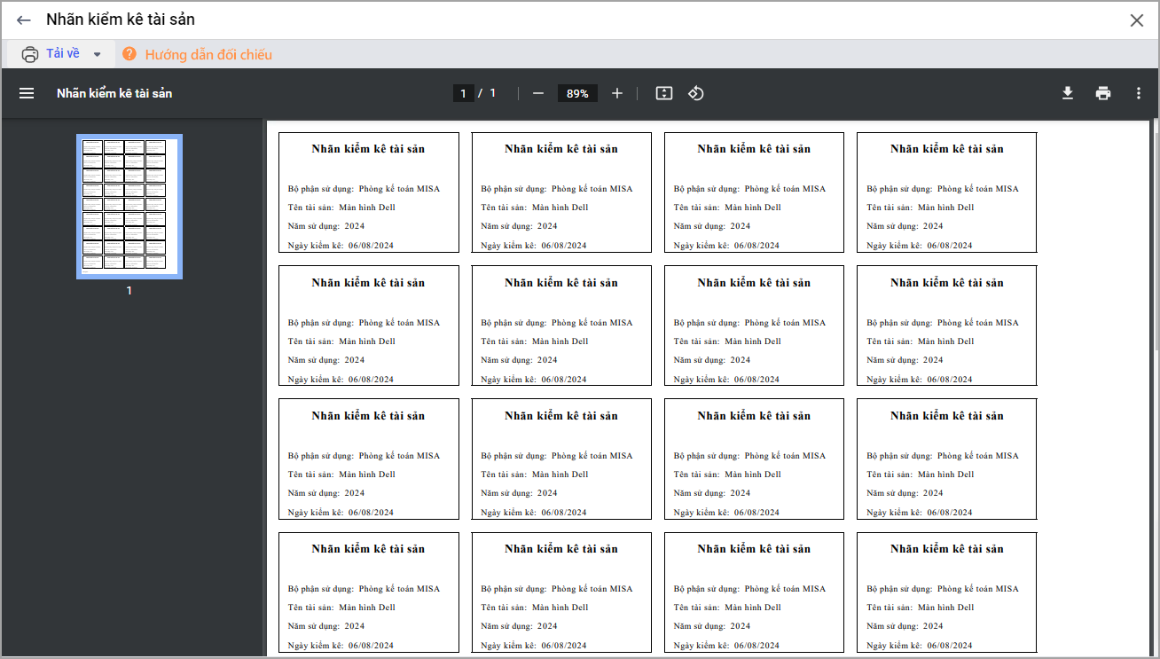 • Chọn In thử để xem trước nội dung được in trong Nhãn kiểm kê tài sản.