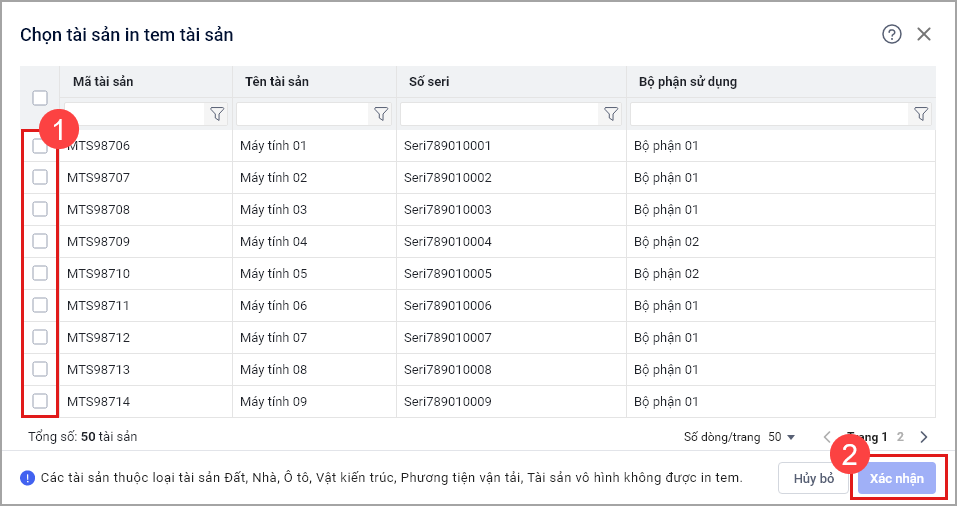 Tích chọn tài sản cần in tem, sau đó chọn Xác nhận