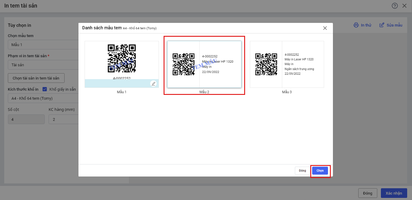 Phần mềm sẽ hiển thị danh sách mẫu tem tương ứng anh/chị chọn mẫu muốn in cho tài sản, sau đó Chọn