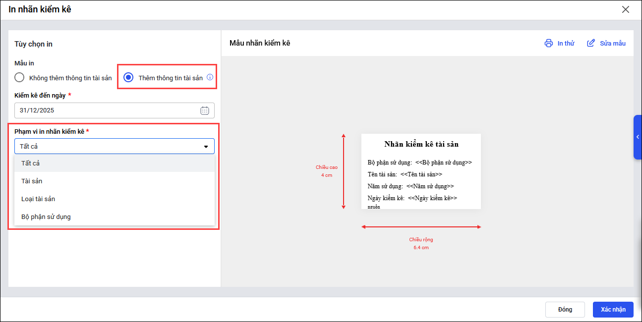• Phạm vi in nhãn kiểm kê (cho phép chọn phạm vi tài sản in nhãn):