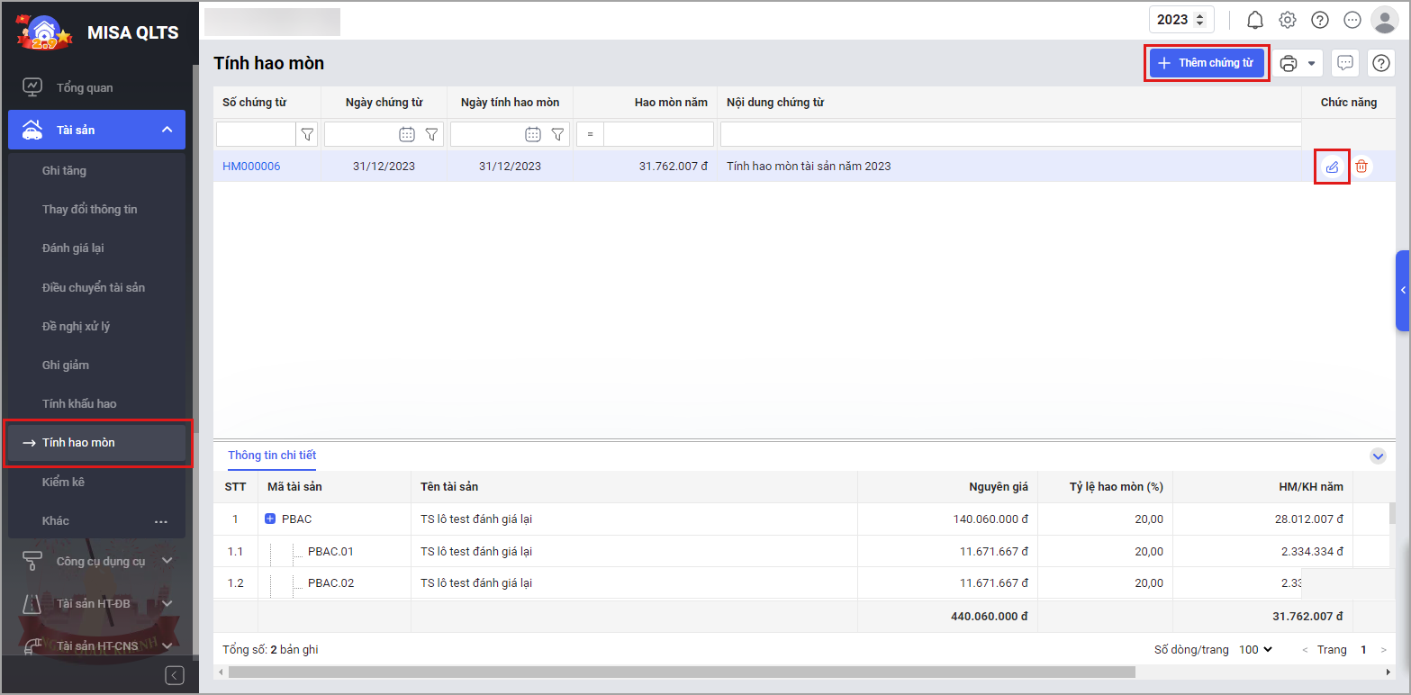 - Tại menu Tính hao mòn\Thêm chứng từ hoặc Sửa chứng từ: