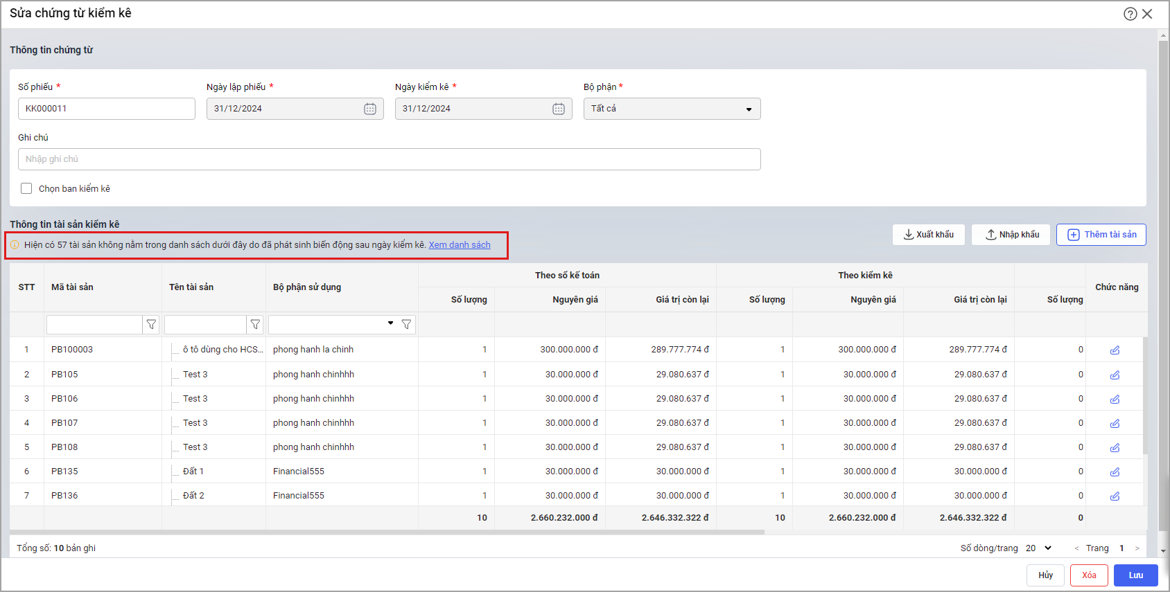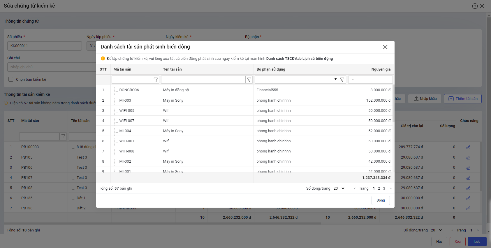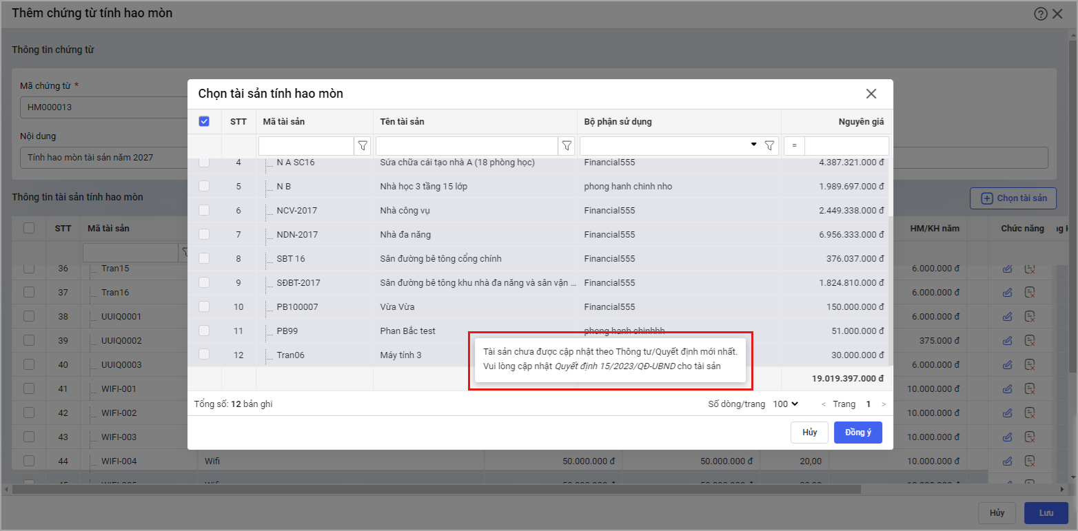 - Trường hợp có tài sản không hiển thị trong danh sách tài sản trên chứng từ, phần mềm có hiển thị cảnh báo