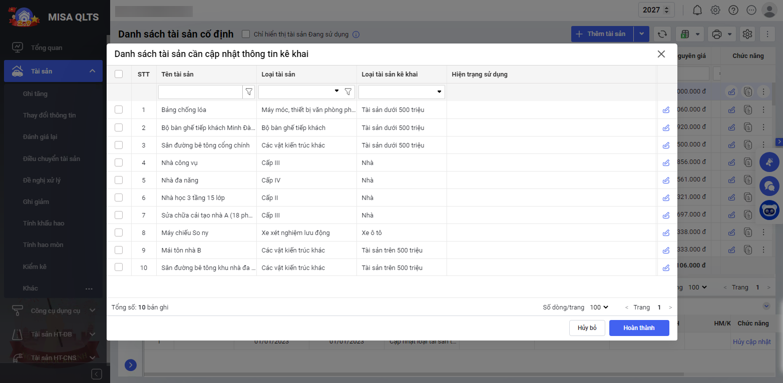 Ví dụ: Tích chọn vào tài sản thiếu hiện trạng sử dụng, phần mềm sẽ điều hướng đến màn hình tài sản thiếu hiện trạng sử dụng. Cán bộ cập nhật hiện trạng sử dụng cho tài sản, sau đó quay trở lại chứng từ tính hao mòn để thêm tài sản vào danh sách tài sản