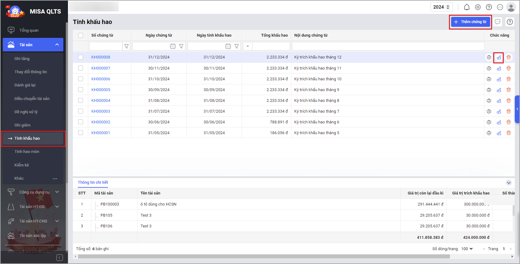 - Tại menu Tính khấu hao\Thêm chứng từ hoặc Sửa chứng từ: