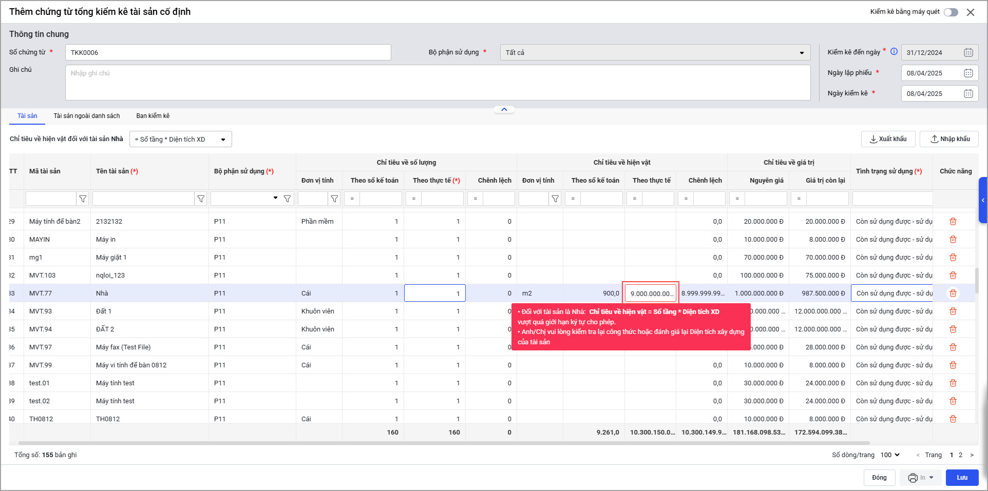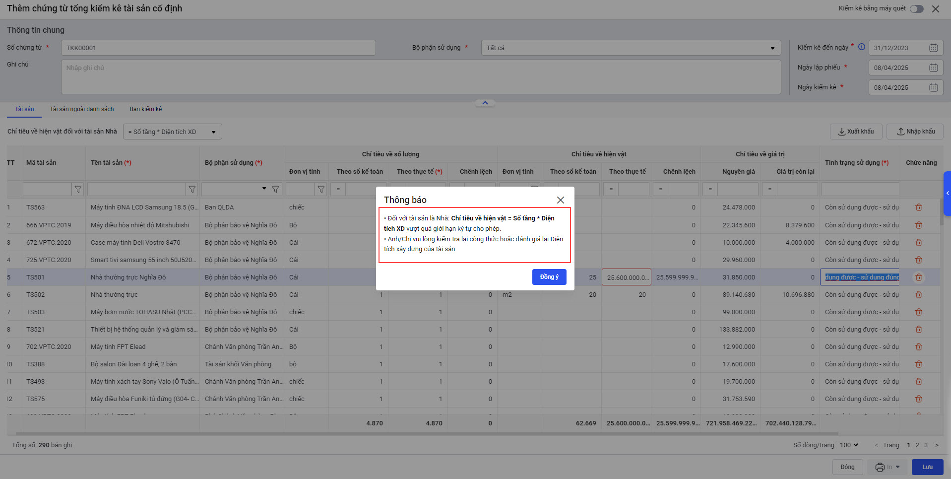 Tại menu Tổng kiểm kê\Tài sản cố định: Khi lập chứng từ Tổng kiểm kê, trường hợp tài sản là Nhà có giá trị không hợp lệ thì khi lưu phần mềm sẽ hiển thị thông báo. Đối với tài sản là Nhà: Chỉ tiêu về hiện vật = Số tầng * Diện tích xây dựng vượt quá giới hạn cho phép. Anh/chị vui lòng kiểm tra lại công thức hoặc đánh giá lại Diện tích xây dựng của tài sản.