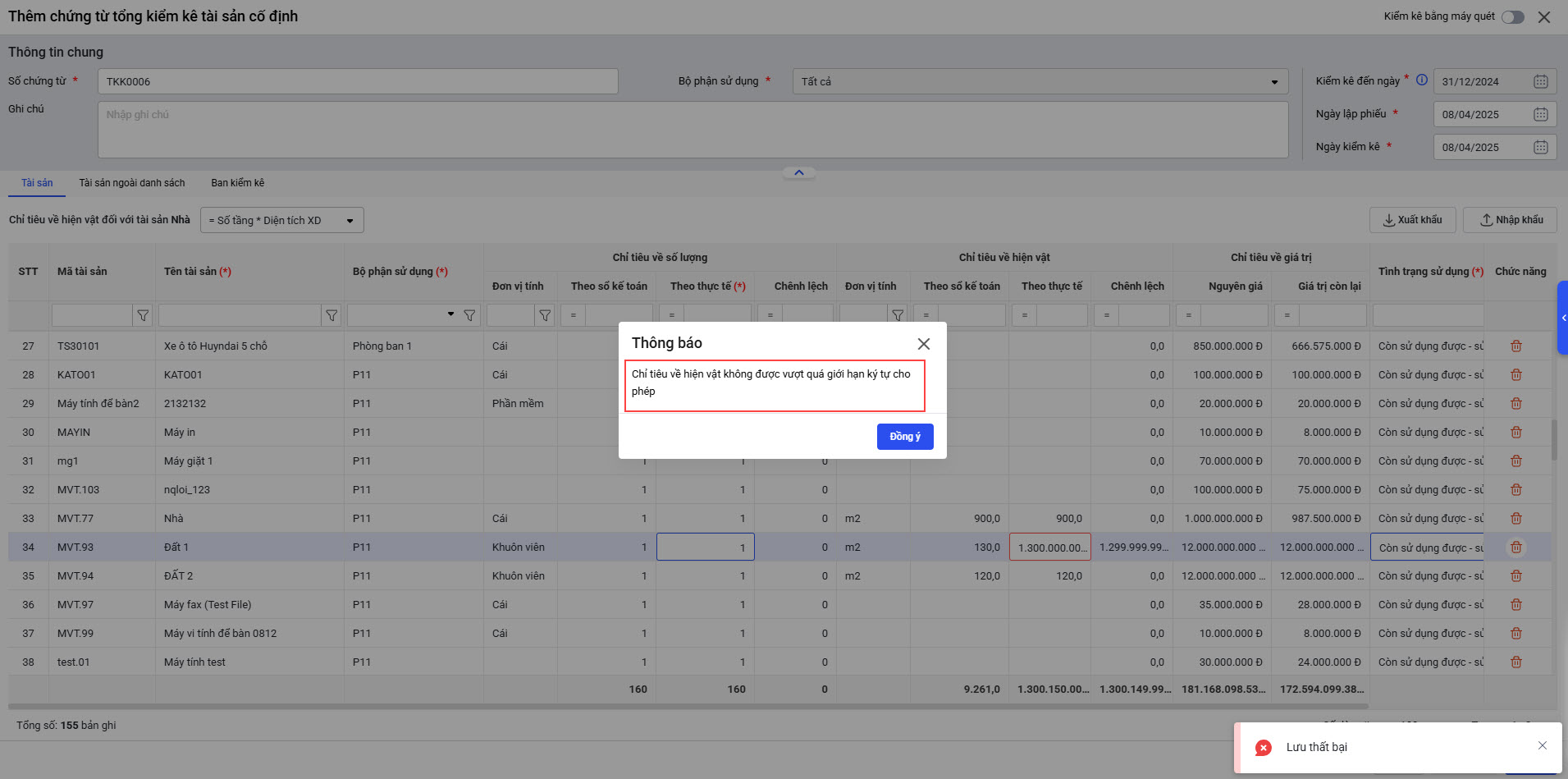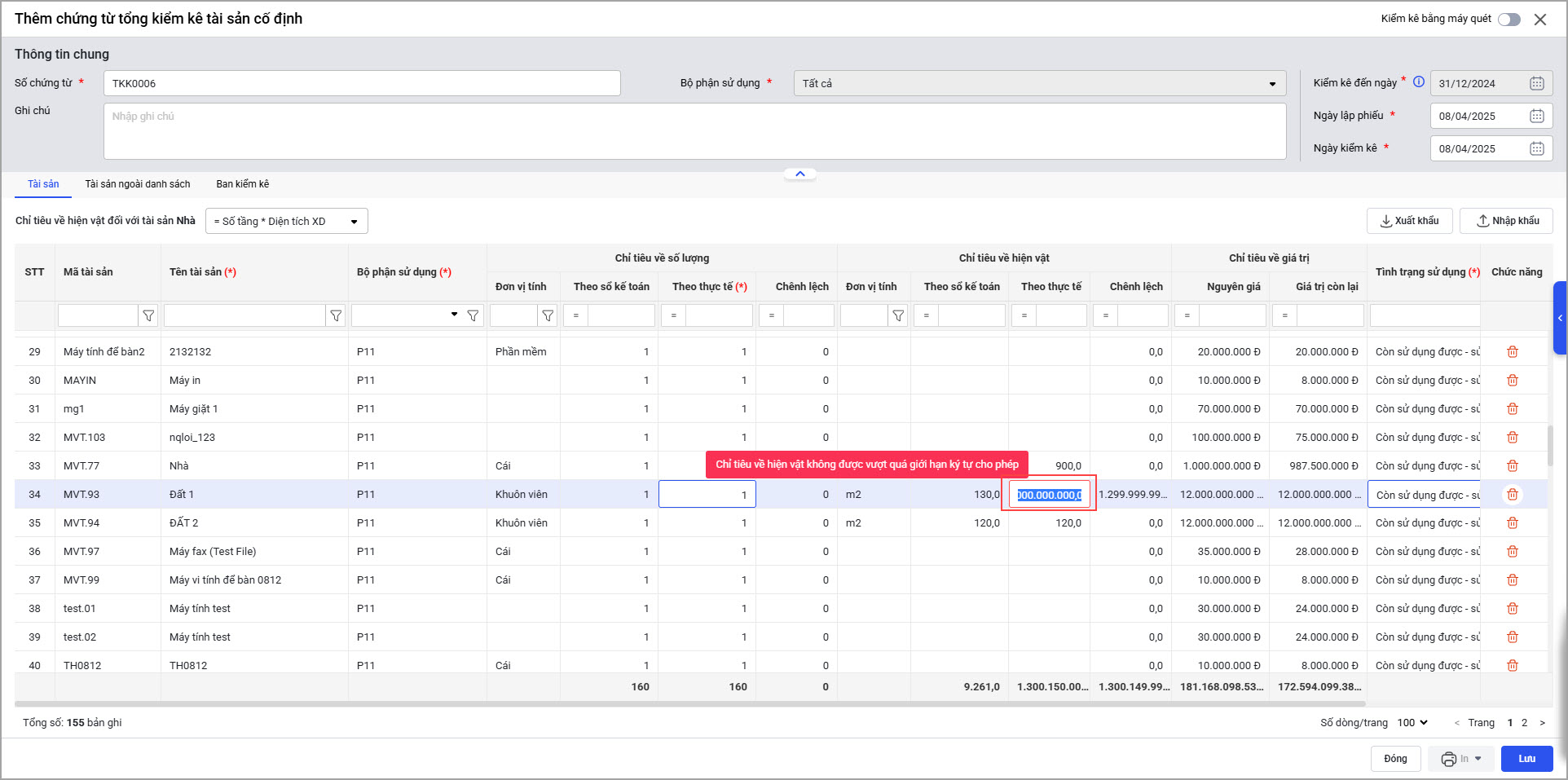 • Khi khai báo tài sản là nhà sai, phần mềm không lưu được chứng từ tổng kiểm kê do Chỉ tiêu về hiện vật vượt quá giới hạn ký tự cho phép nhưng không thông báo rõ nguyên nhân lỗi, gây khó khăn trong việc xác định và sửa lỗi.