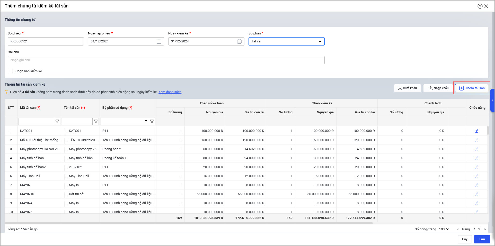 Tại menu Tài sản\Kiểm kê, khi lập chứng từ kiểm kê và chọn Thêm tài sản.