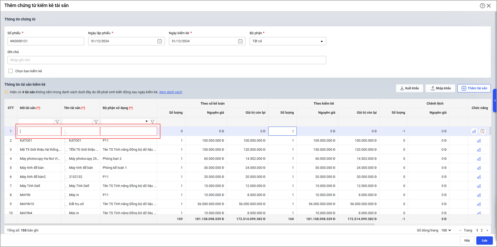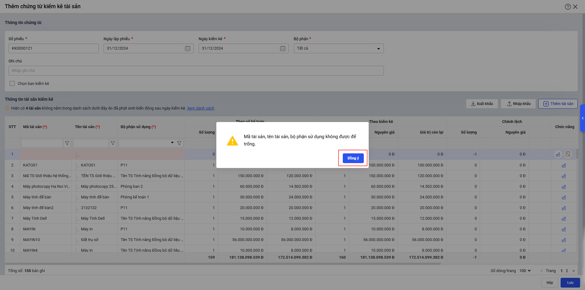 2.2. Cảnh báo trên giao diện chứng từ kiểm kê tài sản