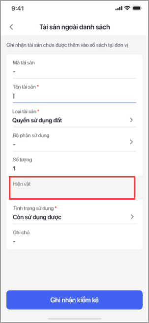 Đối với tài sản là Đất, Nhà thì phần mềm mặc định thông tin Hiện vật để trống nhưng cho phép chỉnh sửa. Đối với tài sản là Vật kiến trúc thì Chỉ tiêu về hiện vật đang lấy lên giá trị Diện tích xây dựng.