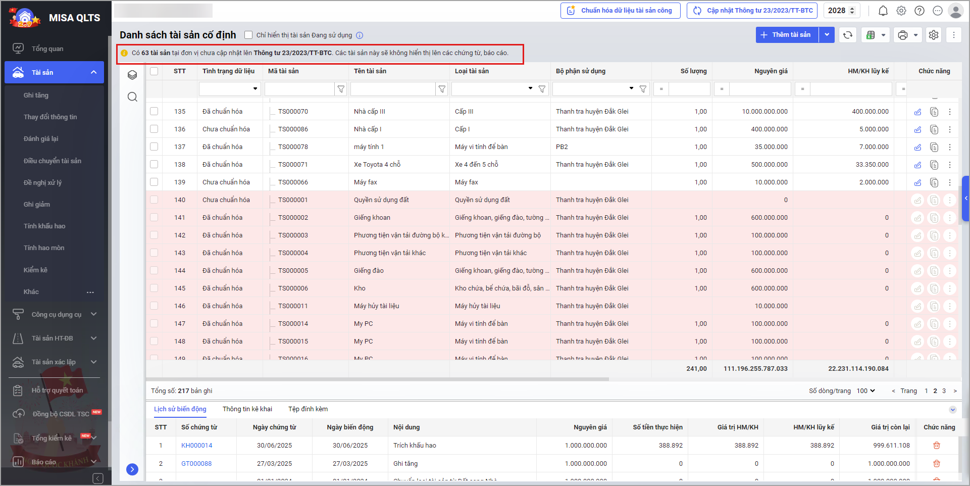 - Tại menu Tài sản\Danh sách tài sản cố định: Phần mềm sẽ hiển thị tại đơn vị có bao nhiêu tài sản chưa cập nhật lên Thông tư/quyết định và các tài sản này sẽ không hiển thị lên chứng từ, báo cáo