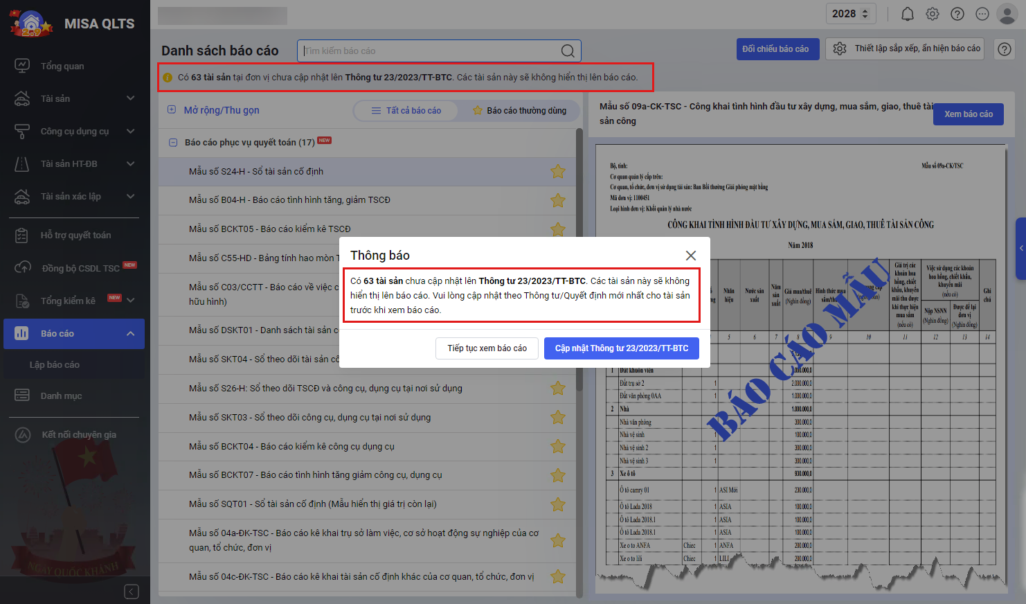 - Khi vào menu Báo cáo: phần mềm cũng sẽ hiển thị thông báo có bao nhiêu tài sản chưa cập nhật thông tư/quyết định mới nhất, và các tài sản này sẽ không hiển thị lên chứng từ báo cáo