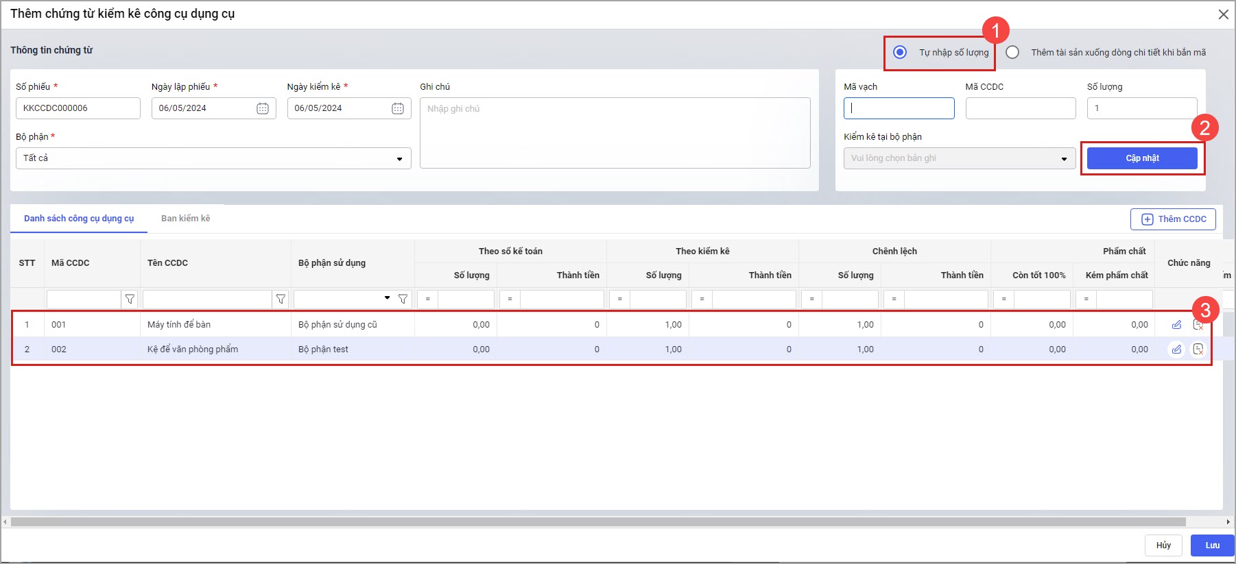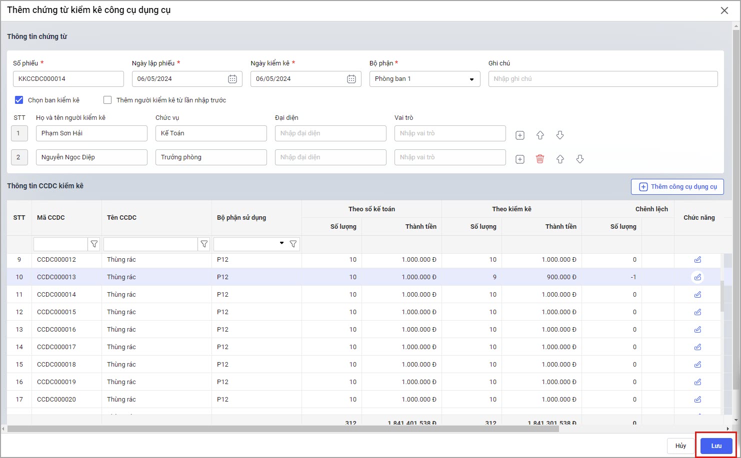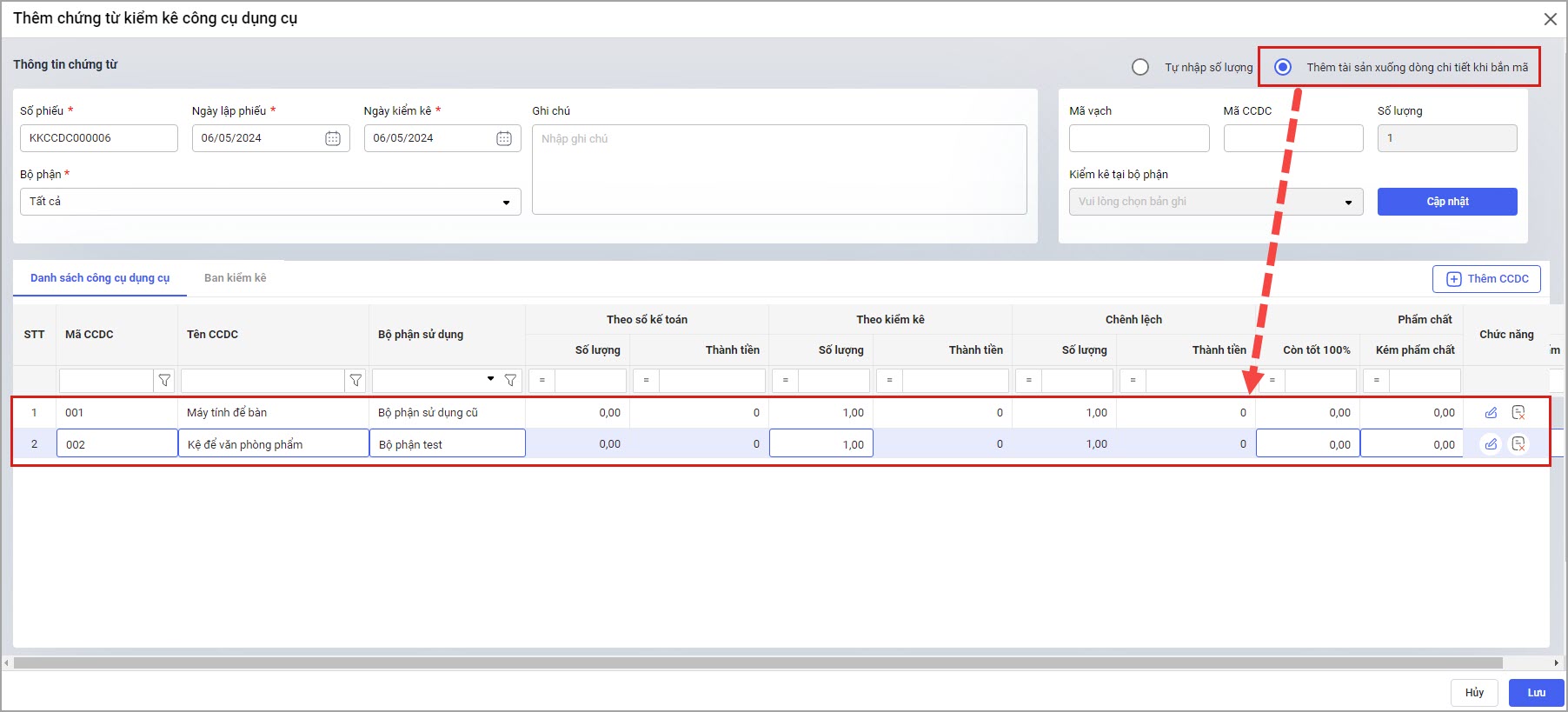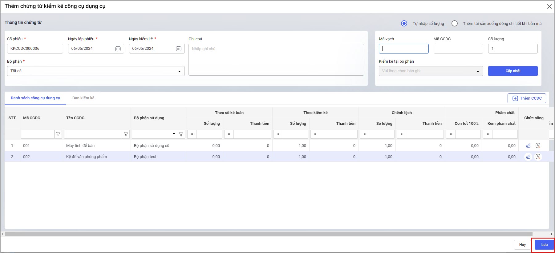Lưu ý: Nếu có CCDC cần phân bổ thì anh/chị phải thực hiện phân bổ CCDC trước khi kiểm kê CCDC. Chứng từ kiểm kê lên CCDC của tất cả các năm, chứ không lên riêng năm lập chứng từ.