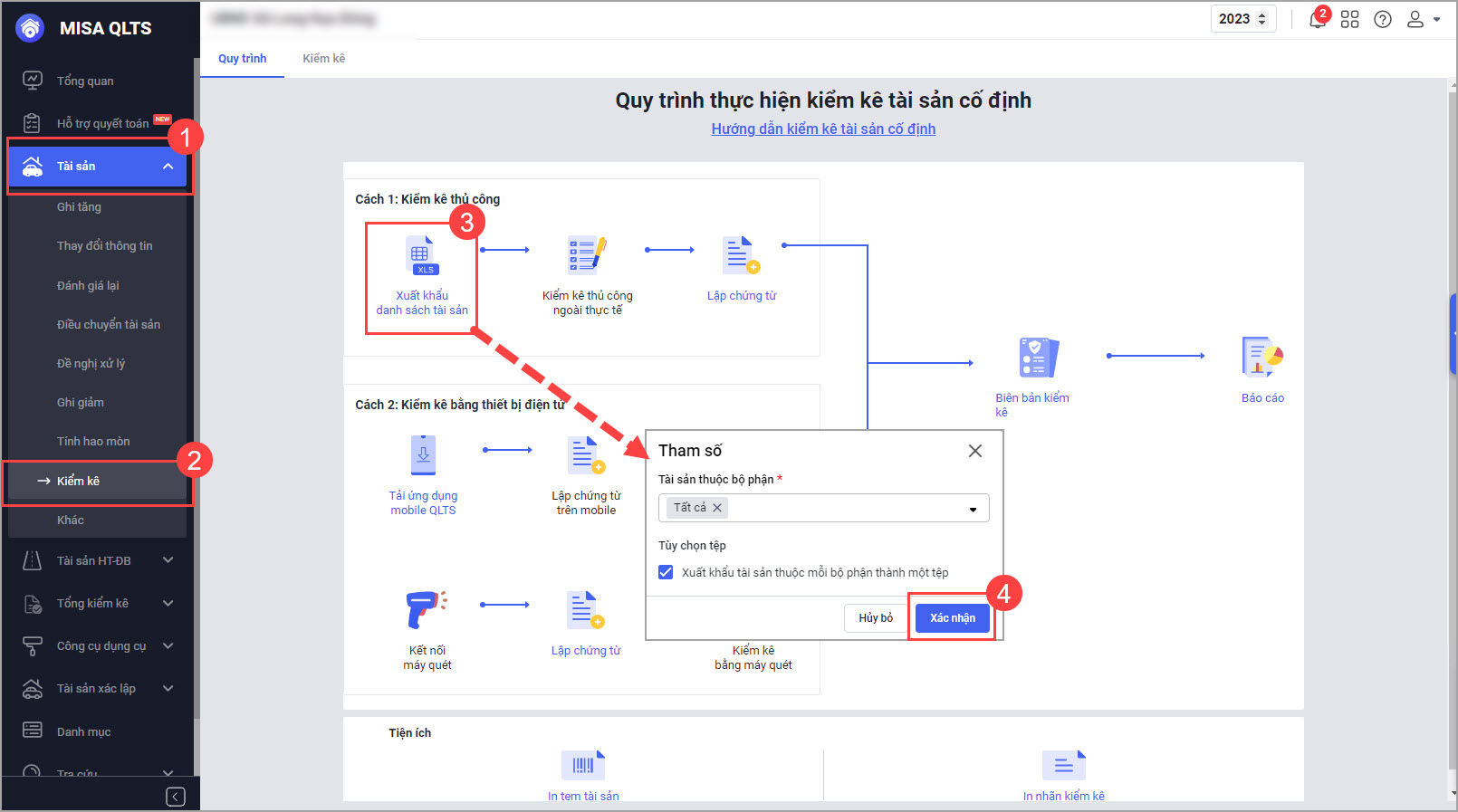 - Tài sản thuộc bộ phận: Chọn bộ phận cần kiểm kê tài sản.