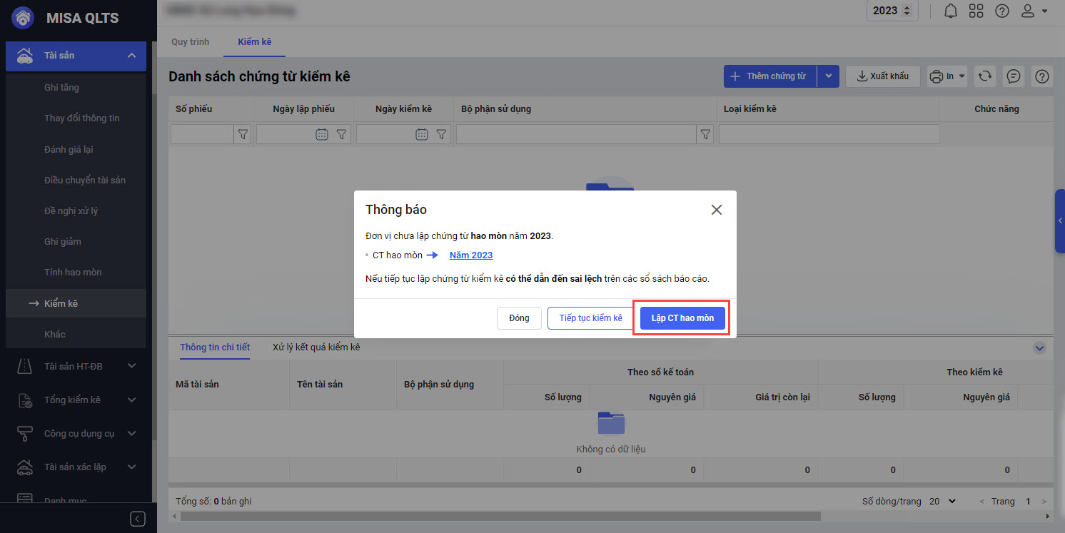 3.7. Làm thế nào khi lập chứng từ kiểm kê TSCĐ, phần mềm báo “Đơn vị cần lập chứng từ ghi tăng cho tài sản trước khi kiểm kê. Nếu tiếp tục lập chứng từ kiểm kê thì có thể dẫn tới thiếu tài sản ở danh sách tài sản cần kiểm kê”?