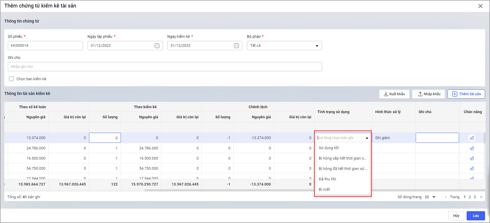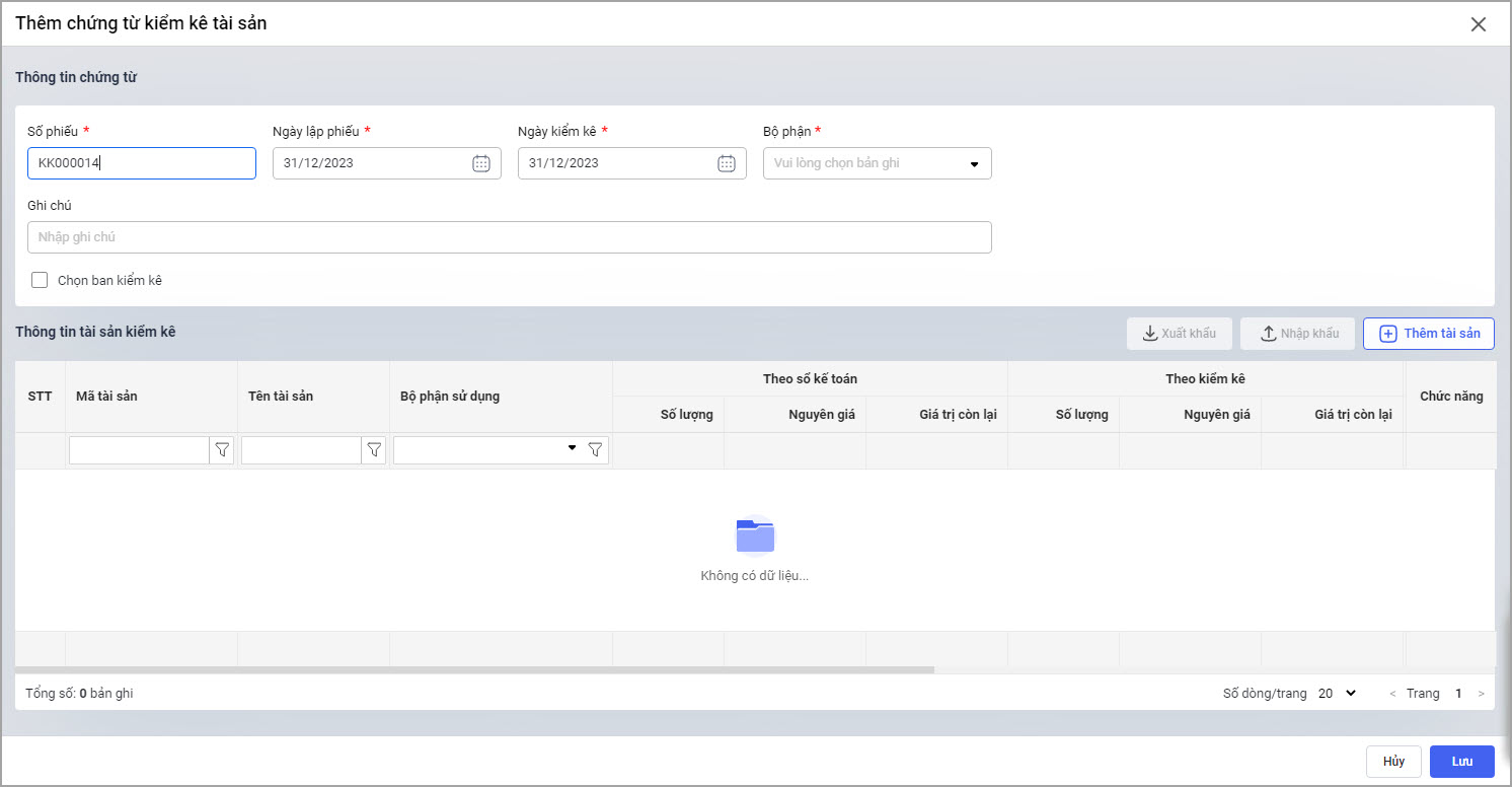 Bước 3: Nhập thông tin chứng từ kiểm kê tài sản