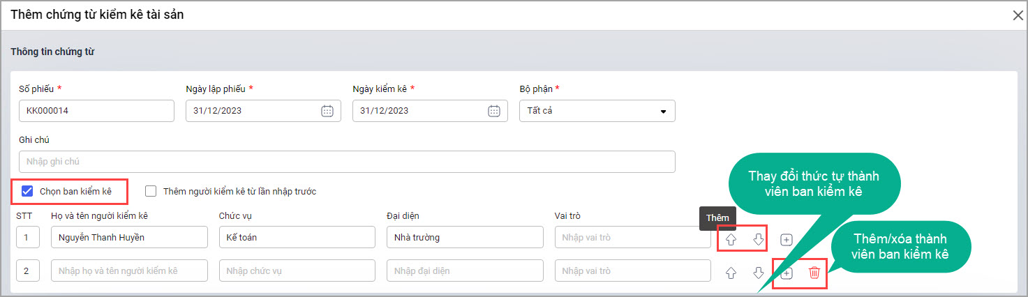 Khi đang lập biên bản kiểm kê hoặc lập xong và đã lưu, nhưng muốn khai báo thêm thành viên trong ban kiểm kê, anh/chị làm như sau: