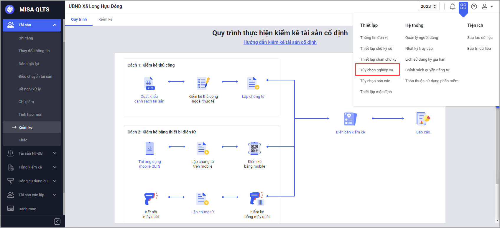 Bước 1: Thiết lập kiểm kê tài sản bằng mã vạch Để kiểm kê bằng mã vạch, trước hết anh/chị cần thiết lập nghiệp vụ và in tem gắn mã cho từng tài sản: