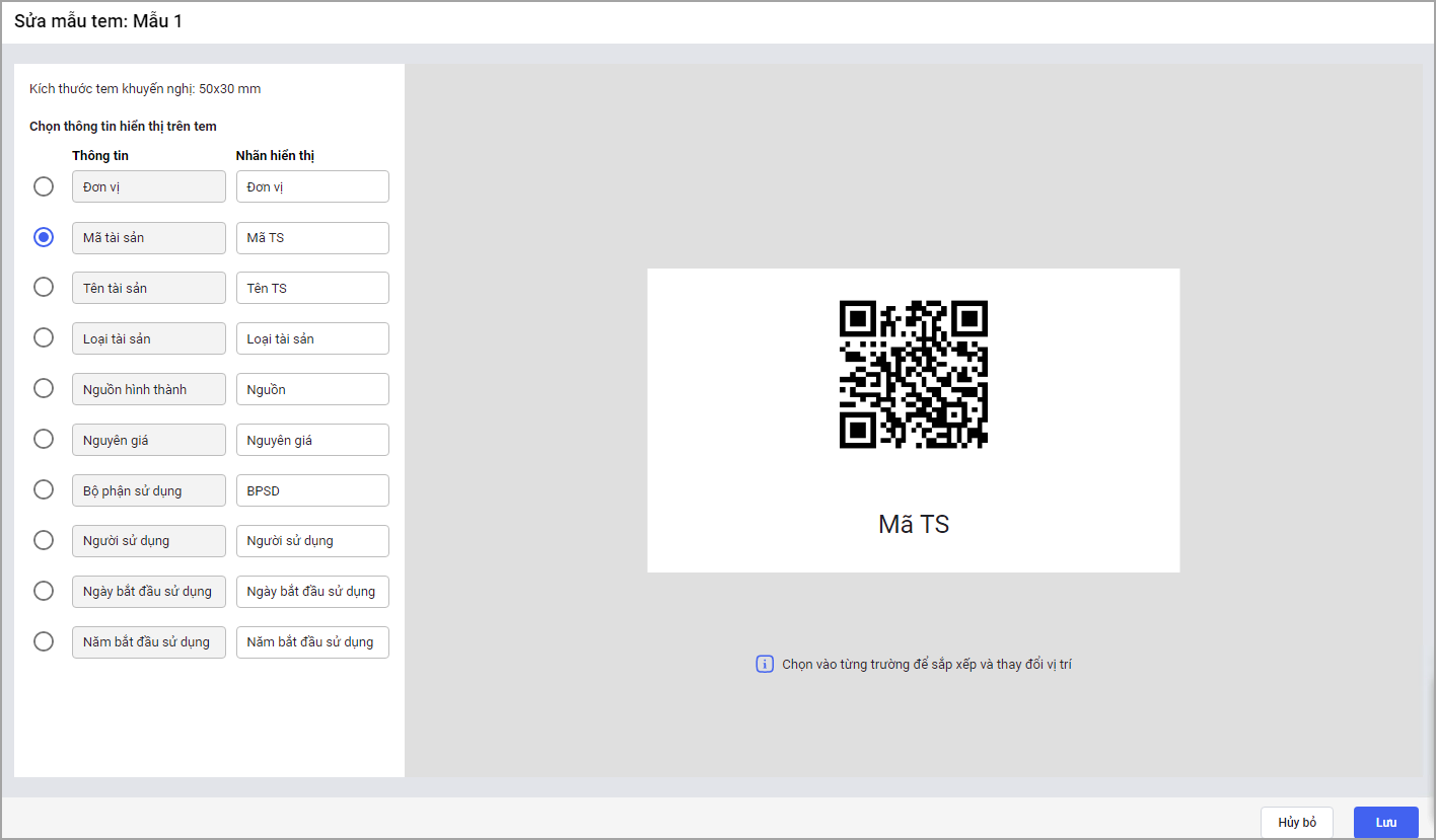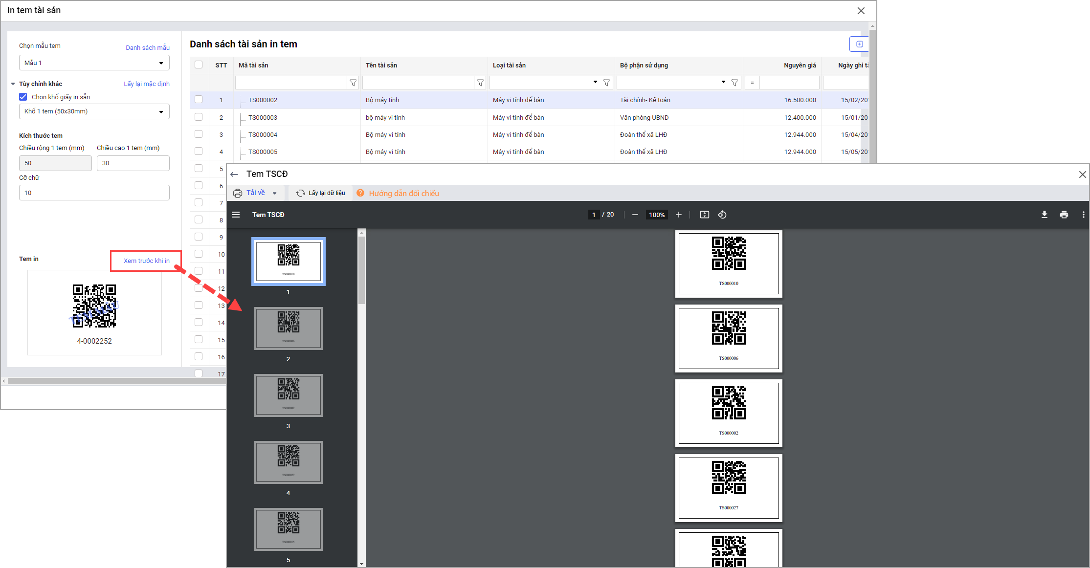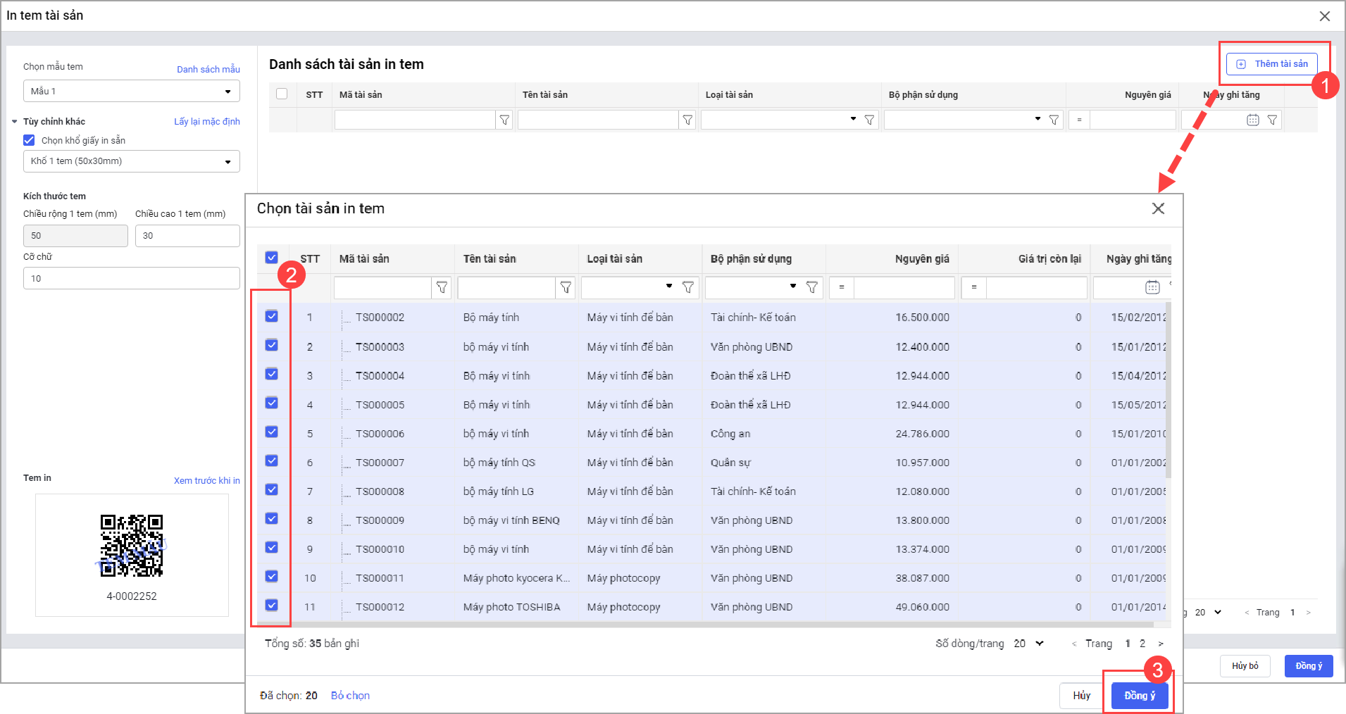 Cán bộ QLTS cũng thực hiện Thiết lập kiểm kê tài sản bằng mã vạch và In tem gắn mã vạch cho tài sản.