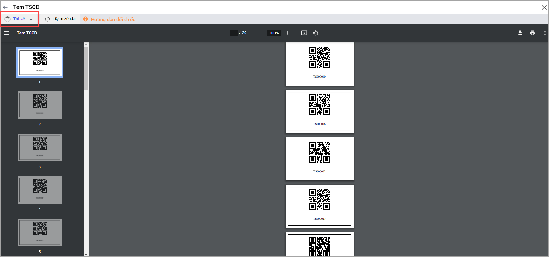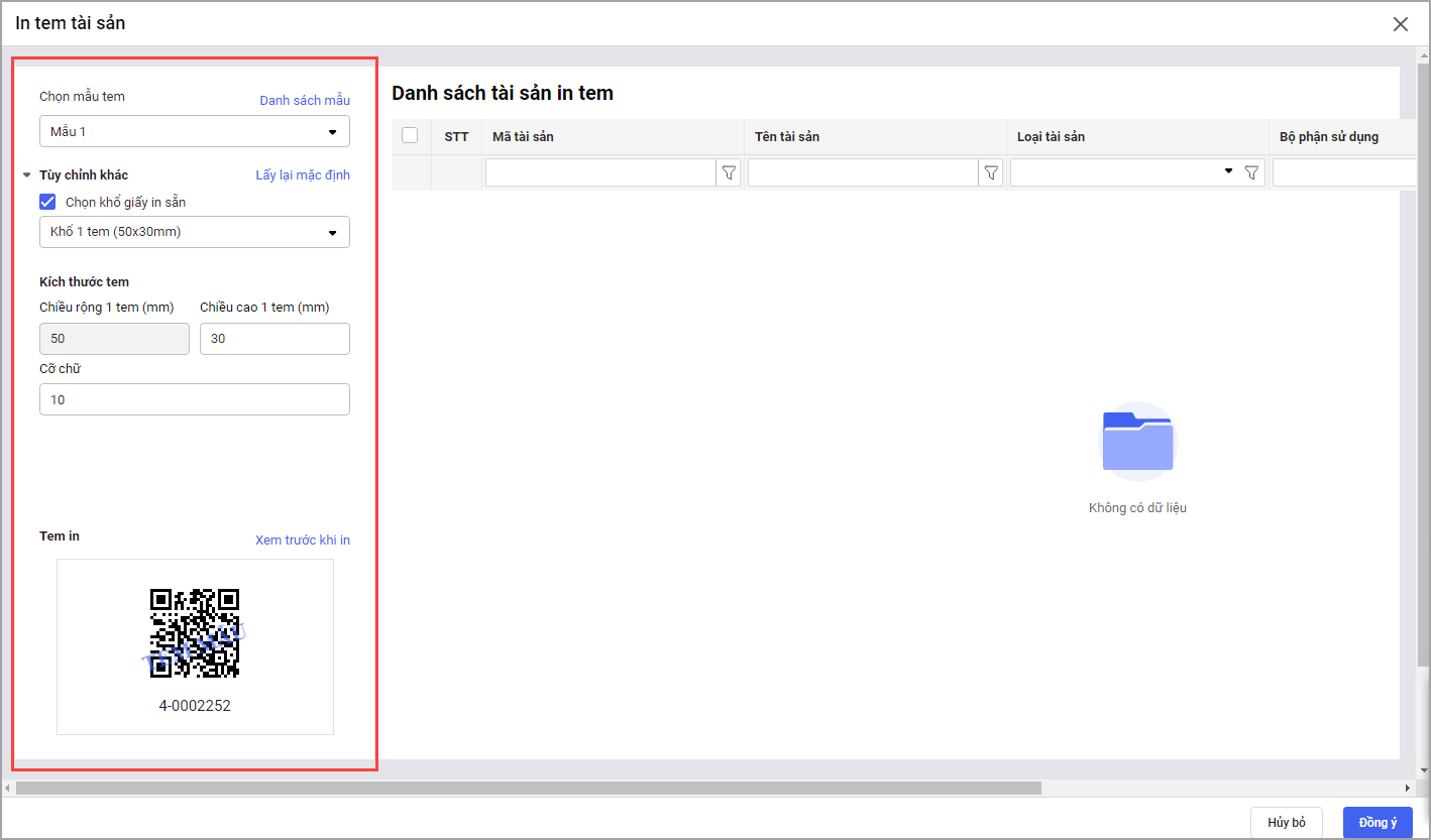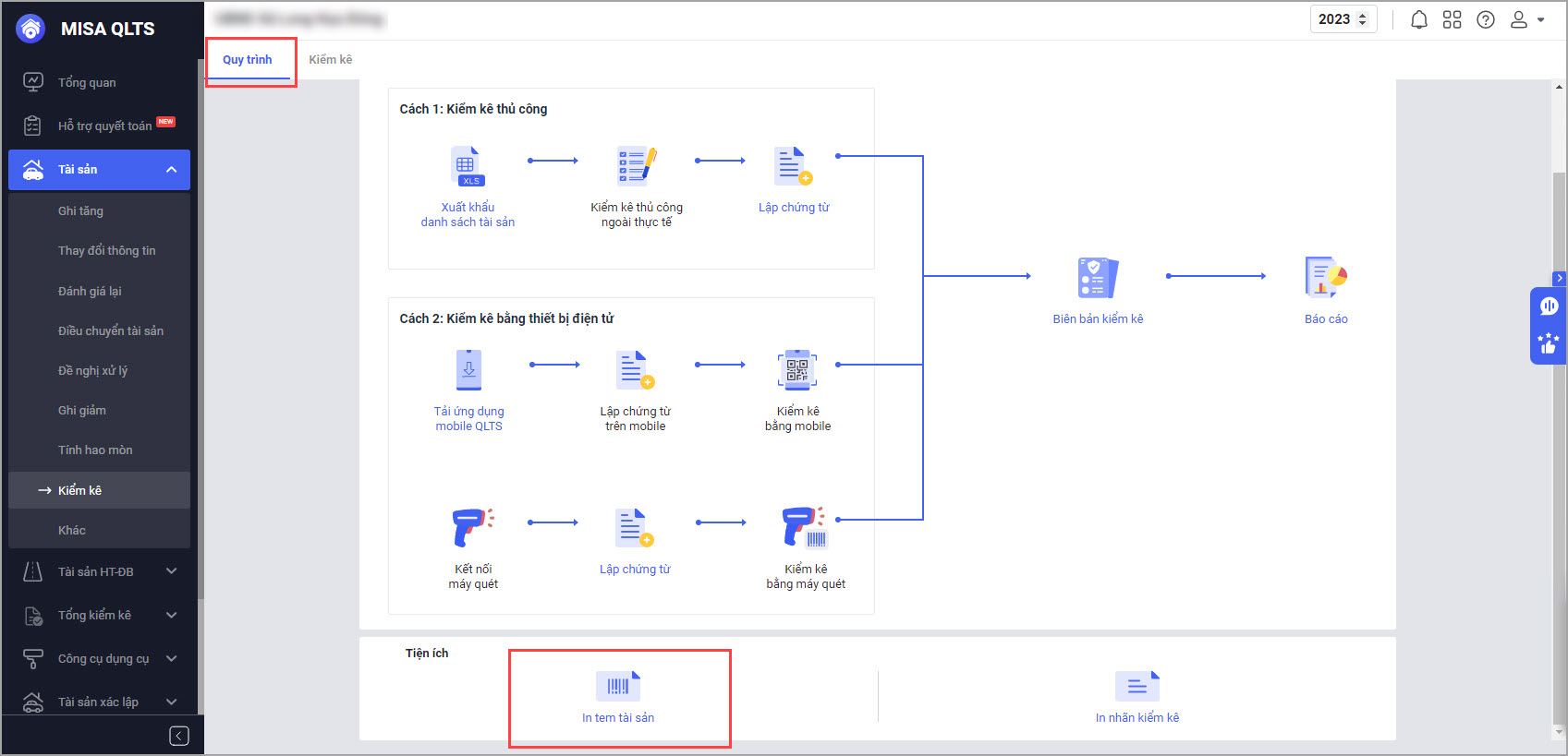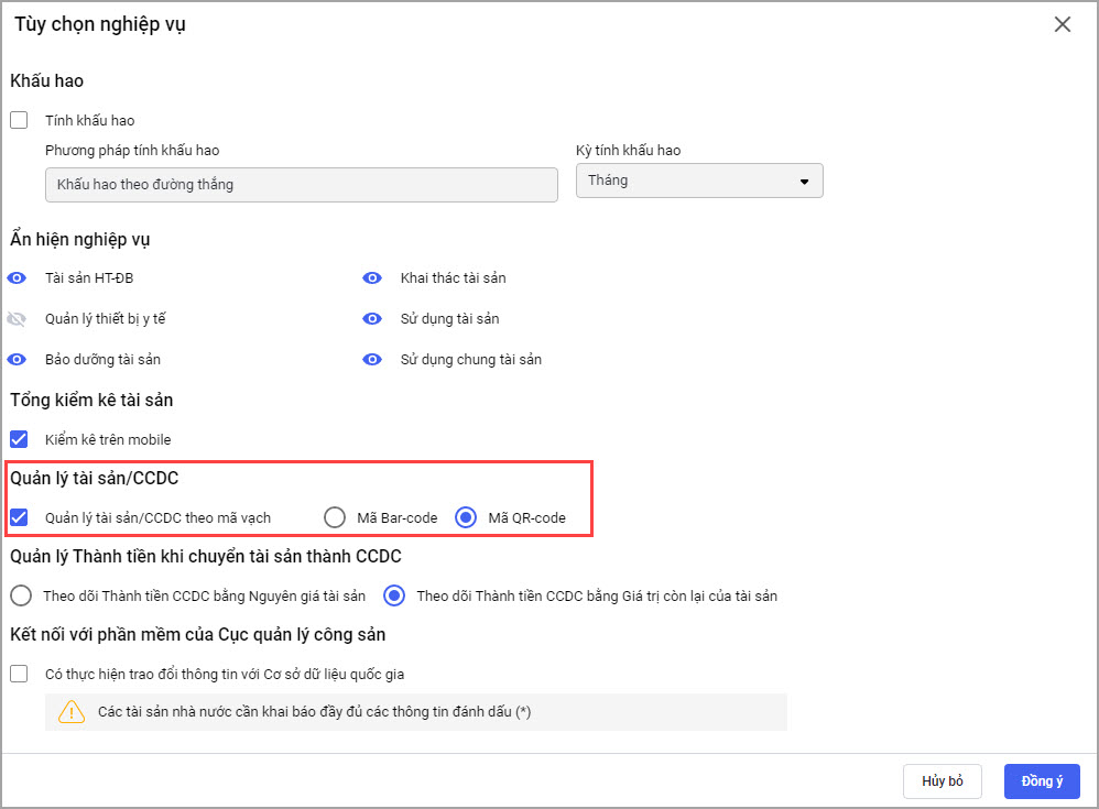 Cán bộ QLTS cũng thực hiện Thiết lập kiểm kê tài sản bằng mã vạch và In tem gắn mã vạch cho tài sản.