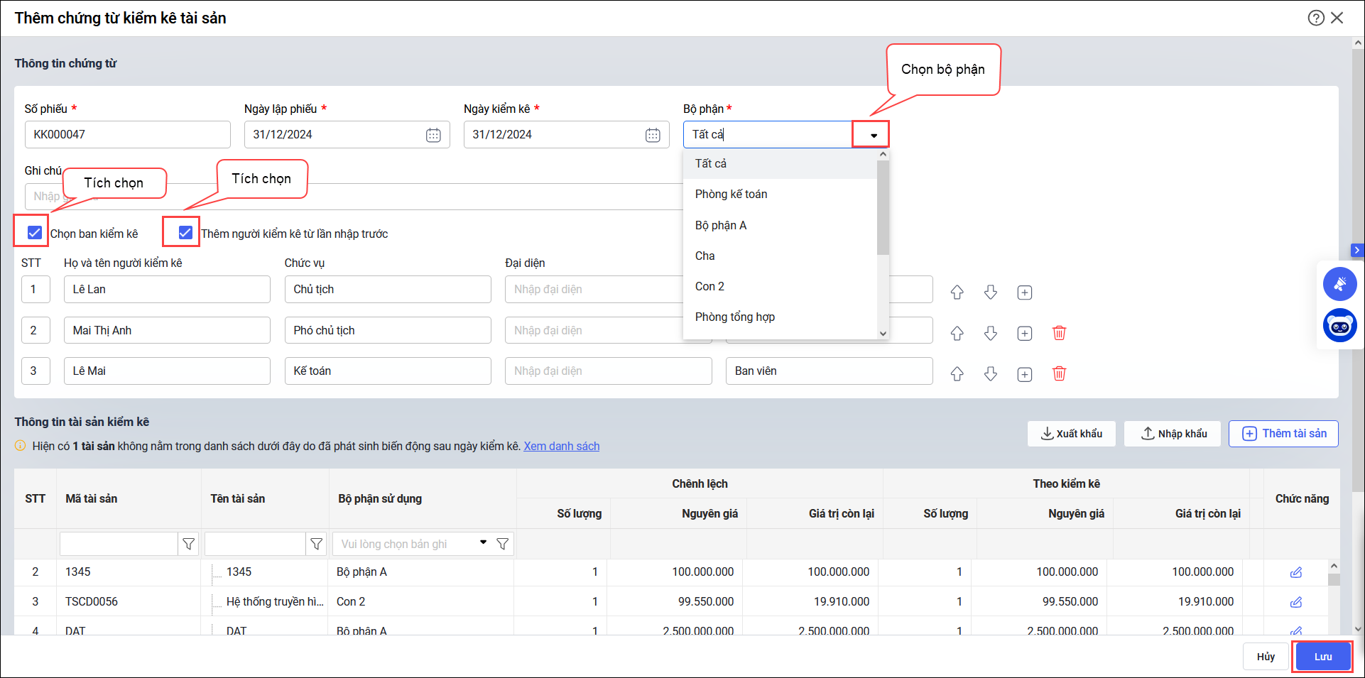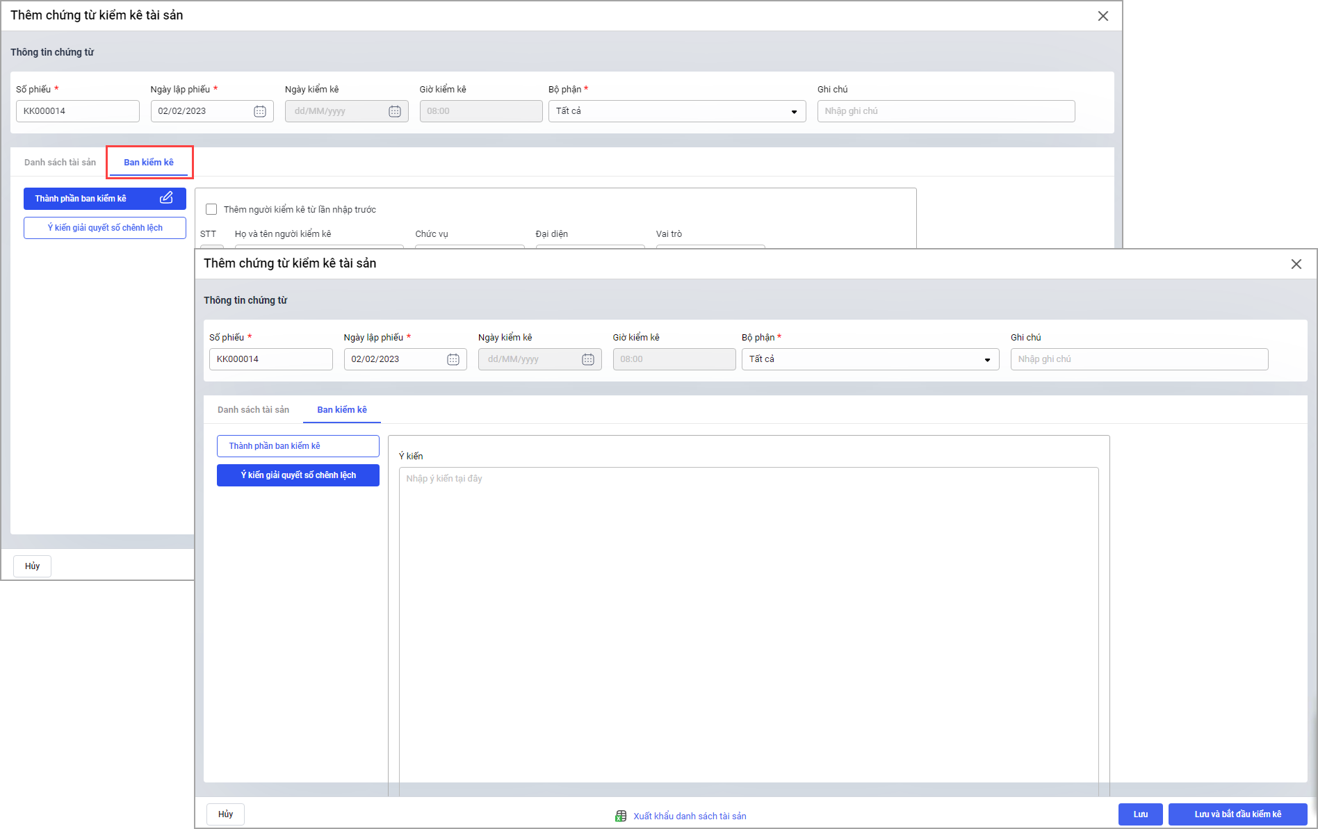 Lưu ý: Thông tin ban kiểm kê chỉ hiển thị trên Biên bản kiểm kê (mẫu C53) khi anh/chị tích chọn và khai báo ban kiểm kê trực tiếp trên chứng từ kiểm kê tài sản trong phân hệ Tài sản.
