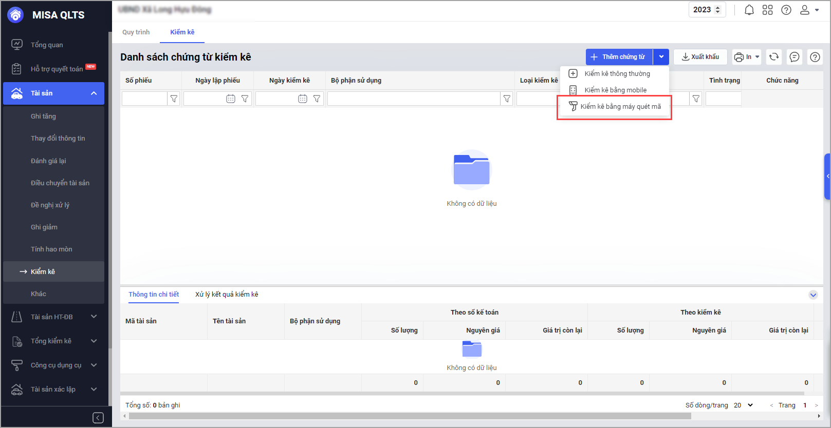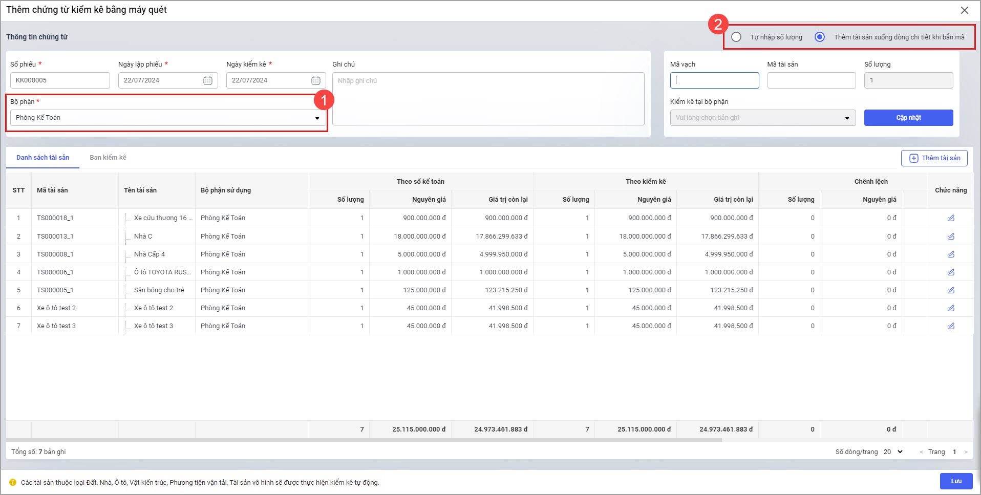 Bước 2: Chọn Bộ phận sử dụng tài sản cần thực hiện kiểm kê. Chọn phương thức thêm tài sản ở chứng từ sau đó đưa máy quét vào mã vạch gắn trên từng tài sản để quét mã.