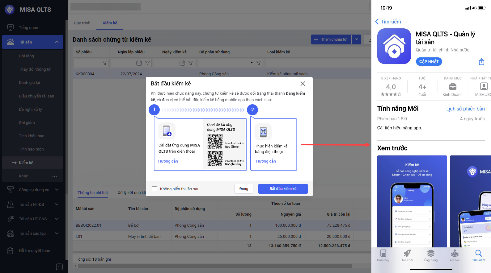 Bước 1: Vào Tài sản\Kiểm kê, nhấn Lập chứng từ kiểm kê, chọn Kiểm kê bằng máy quét mã.
