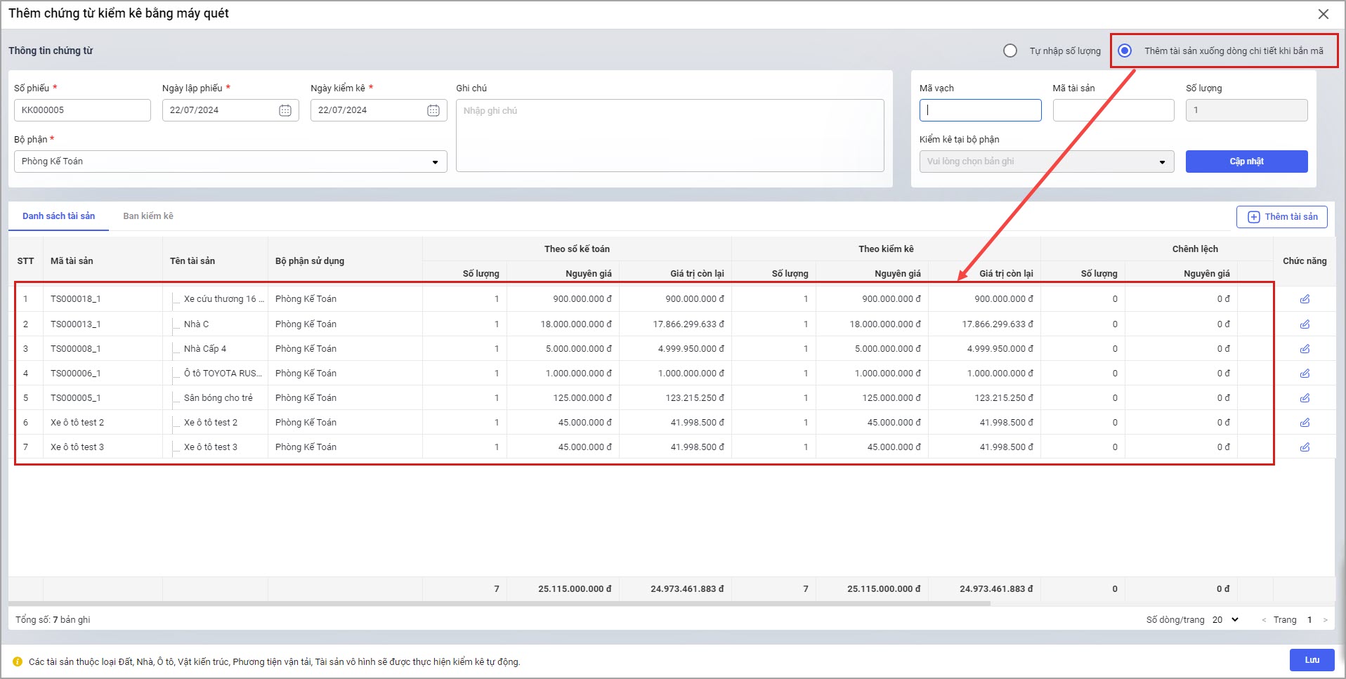 - Nếu chọn Thêm tài sản xuống dòng chi tiết khi bắn mã thì sau khi quét mã, thông tin tài sản sẽ tự động hiển thị ở danh sách tài sản. Mỗi mã tài sản sẽ hiển thị ở 1 dòng riêng.