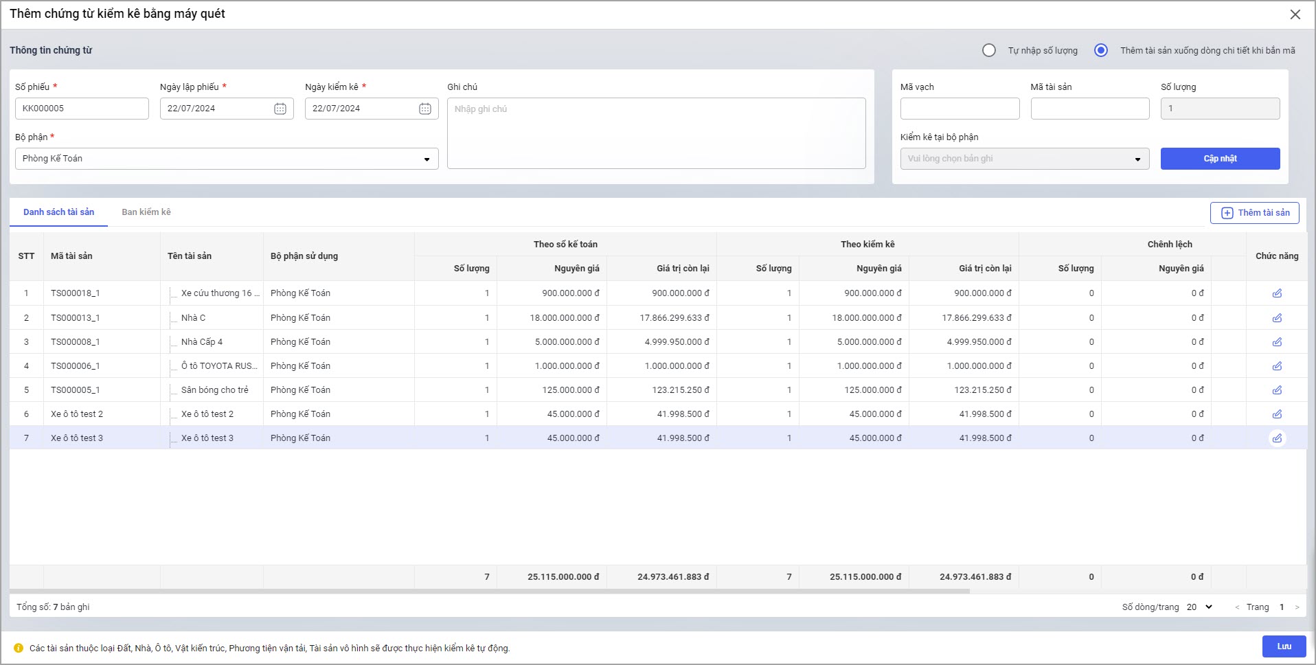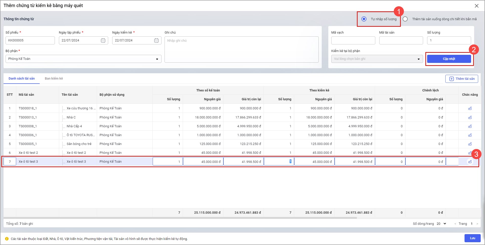 - Nếu chọn Tự nhập số lượng thì sau khi quét mã, anh/chị cần tự nhập tay số lượng tài sản và nhấn Cập nhật để đưa tài sản vào danh sách chi tiết.