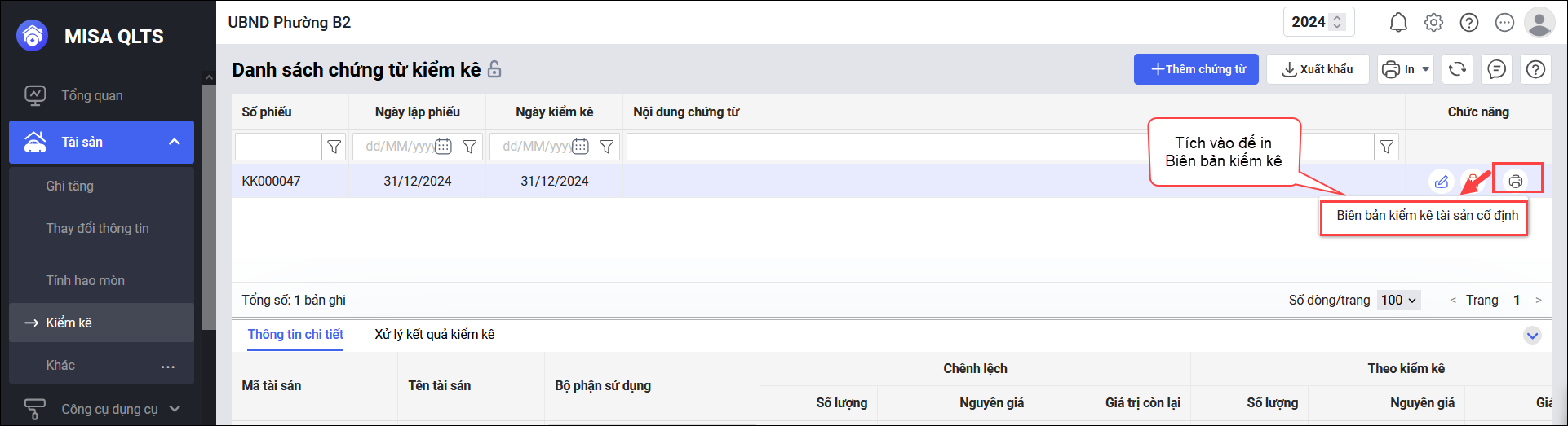 Nguyên nhân: Khi lập chứng từ kiểm kê tài sản, nếu anh/chị thấy không hiển thị đủ tài sản hoặc bị thiếu tài sản trong danh sách kiểm kê, nguyên nhân thường là do đã phát sinh các chứng từ làm thay đổi trạng thái tài sản sau ngày kiểm kê như: ghi giảm tài sản, điều chuyển tài sản, hoặc chuyển TSCĐ sang CCDC.