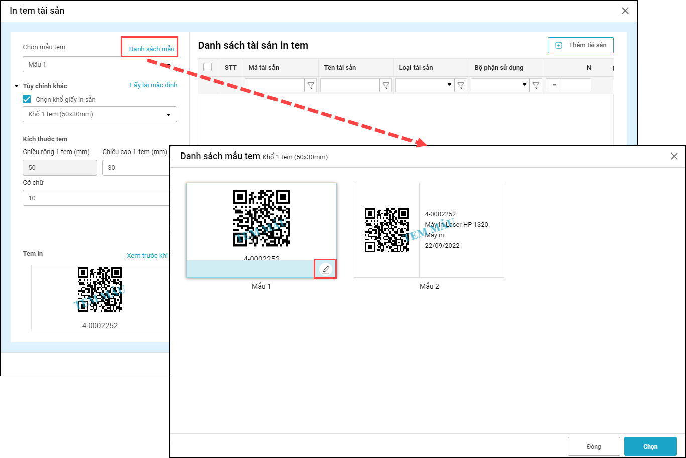 Nhấn vào Danh sách mẫu để xem các mẫu tem và tùy chọn thông tin hiển thị trên tem.