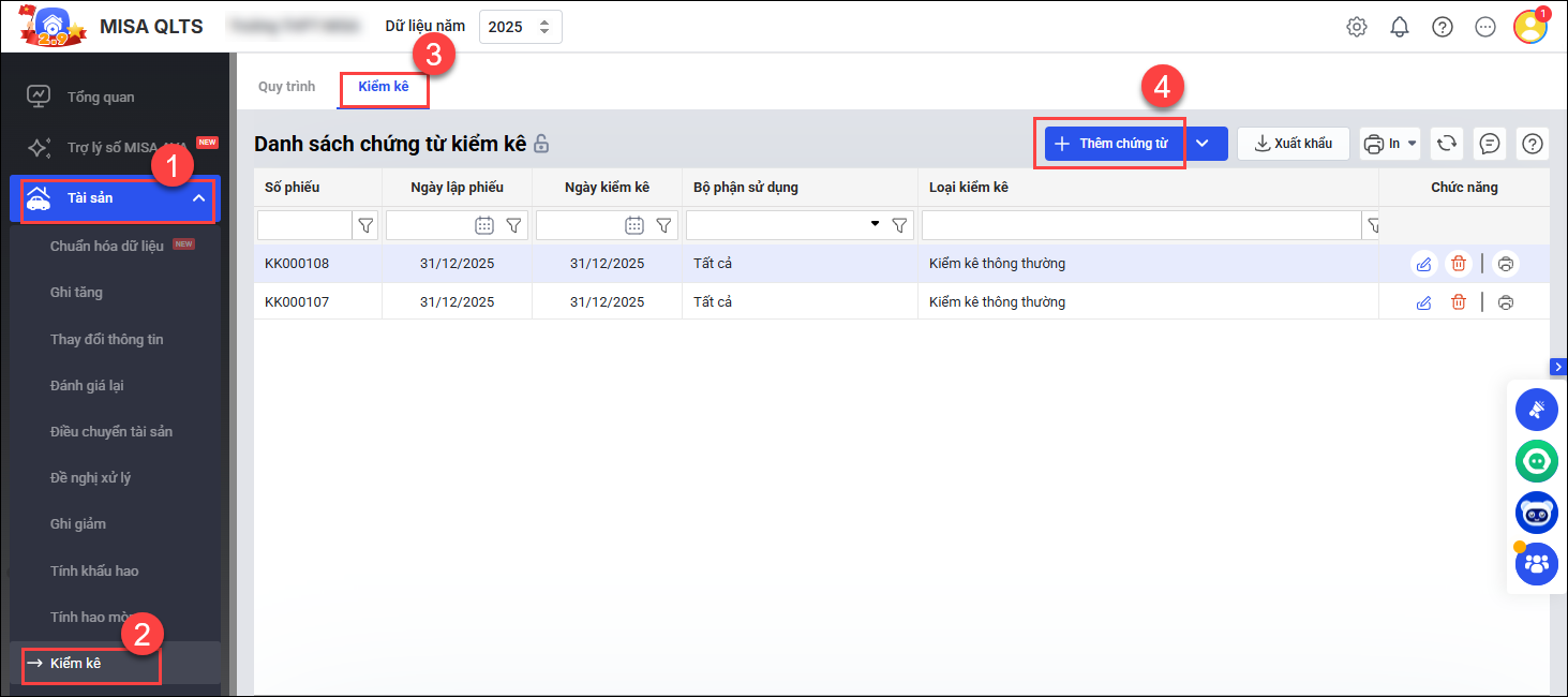 Giải pháp: Trên phần mềm, các chứng từ phải được lập theo đúng thứ tự thời gian phát sinh. Hệ thống sẽ căn cứ vào trạng thái tài sản tại thời điểm chứng từ gần nhất. Vì vậy nếu đã lập chứng từ ngày sau (ví dụ 25/08/2025) trước, thì khi lập chứng từ kiểm kê ngày trước đó (24/08/2025) tài sản có thể không còn hiển thị để kiểm kê. Anh/chị thực hiện: