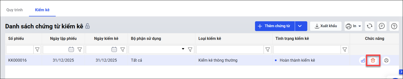 Giải pháp: Trong trường hợp kiểm kê bị sai số liệu, còn thiếu tài sản hoặc cần kiểm kê bổ sung, tại danh sách chứng từ kiểm kê, anh/chị xóa chứng từ kiểm kê bằng cách nhấn vào biểu tượng thùng rác. Sau khi xóa, anh/chị thực hiện Thêm chứng từ kiểm kê mới để ghi nhận đầy đủ tài sản thực tế.